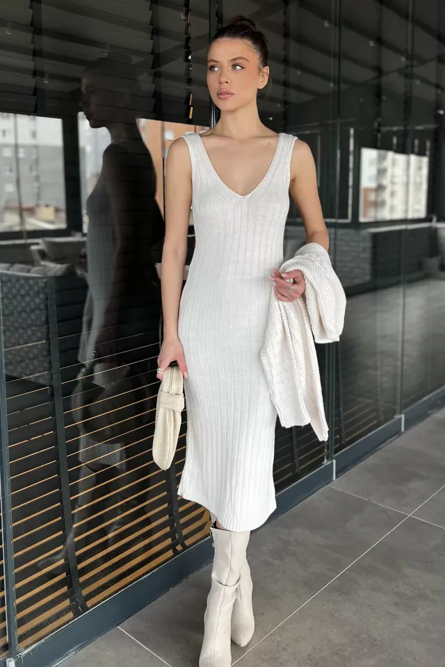 فستان ميدي منقط بياقة مربعة وأكمام بالون وشق جانبي للنساء - Beyond Store