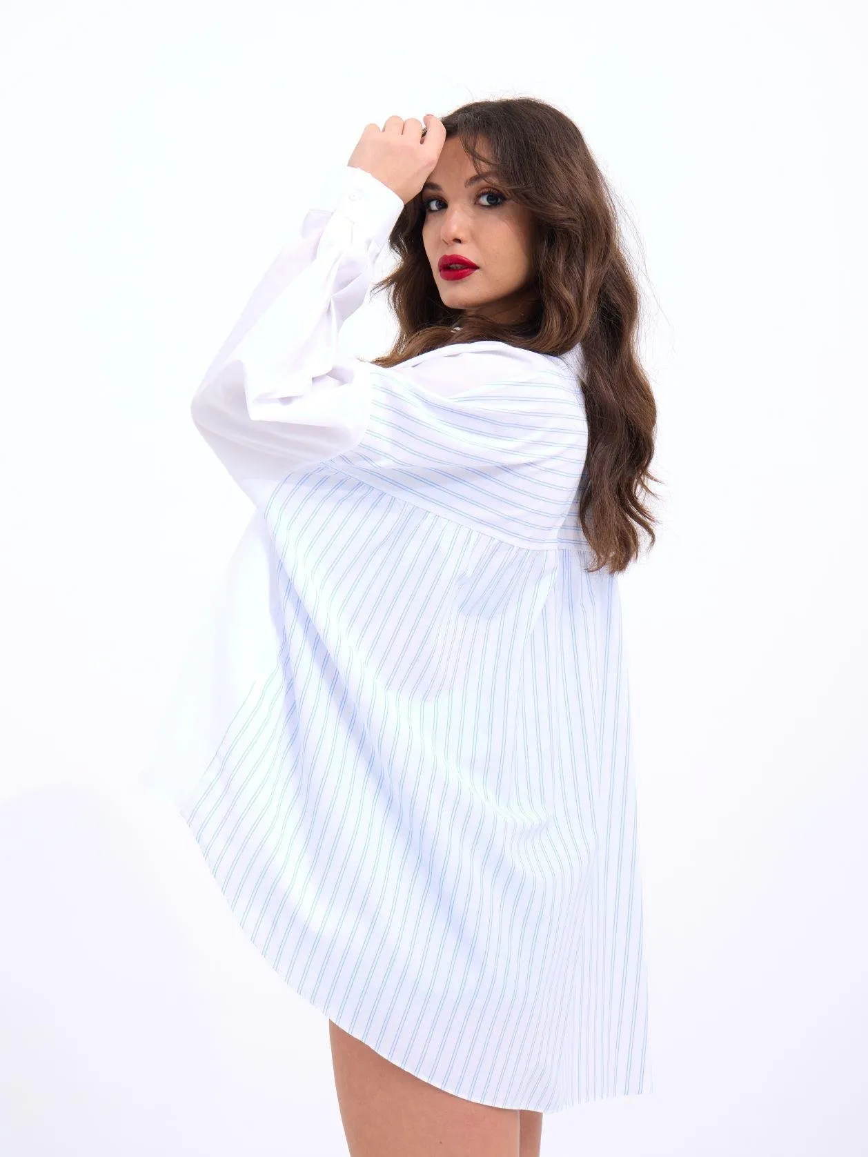 قميص مخطط أوفر سايز بكتف منخفض وجيب أمامي وأزرار، قطعة أساسية مثالية لتنسيقات صيفية مريحة للنساء.