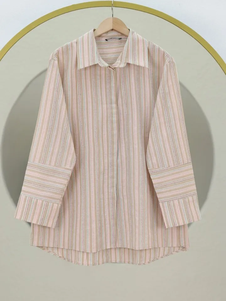 قميص مخطط أوفر سايز بجيب أمامي وأزرار للنساء - Beyond Store