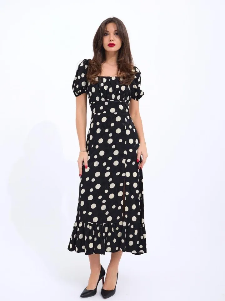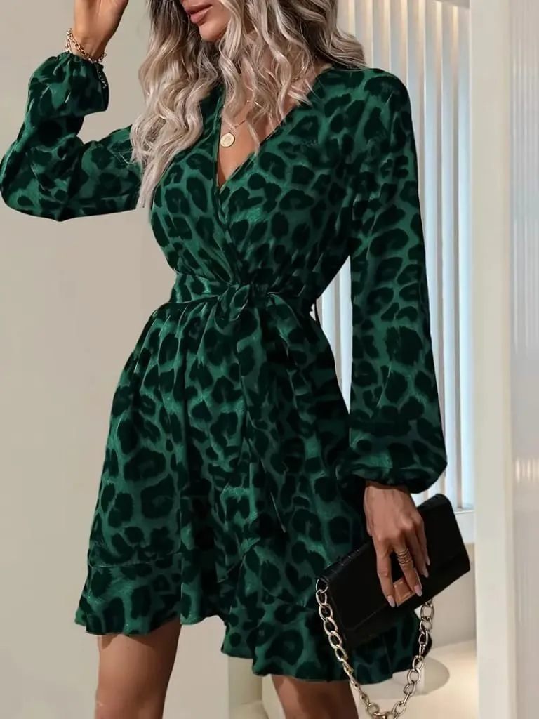 فستان نسائي قصير من الكريب اللامع بقصة واسعة وياقة V مع أكمام قصيرة، خيار خفيف وأنيق لأيام العيد.