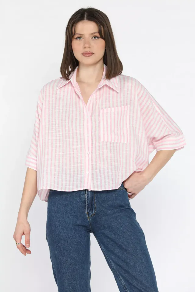 قميص تونك مخطط بتفصيل درز جانبي وكتف منخفض مع أزرار أمامية، قطعة أوفر سايز أنيقة لتنسيقات صيفية مريحة.