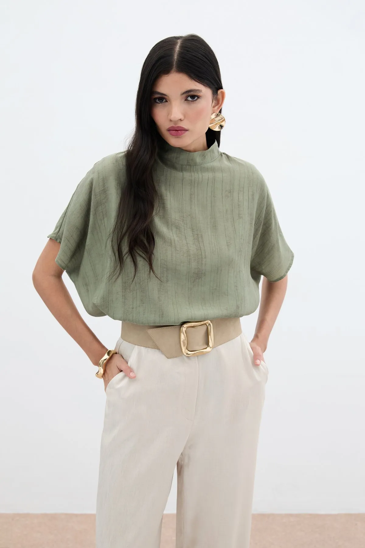 بلوزة بياقة صينية وأكمام قصيرة بتصميم ناعم، مثالية للإطلالات اليومية الأنيقة.