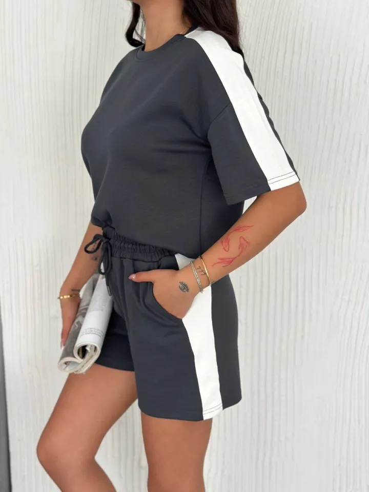 طقم نسائي قميص كتان واسع بأكمام قصيرة وشورت بخصر عالي ومطاطي للنساء