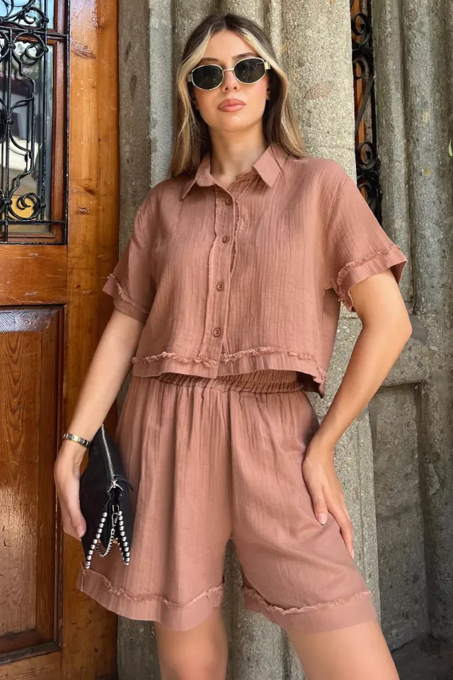 خليكِ على راحتك بإطلالة كيوت مع طقم نسائي من قميص كتان واسع بأكمام قصيرة وشورت بخصر عالي ومطاطي، تصميم صيفي عملي للنساء يناسب كل يوم.