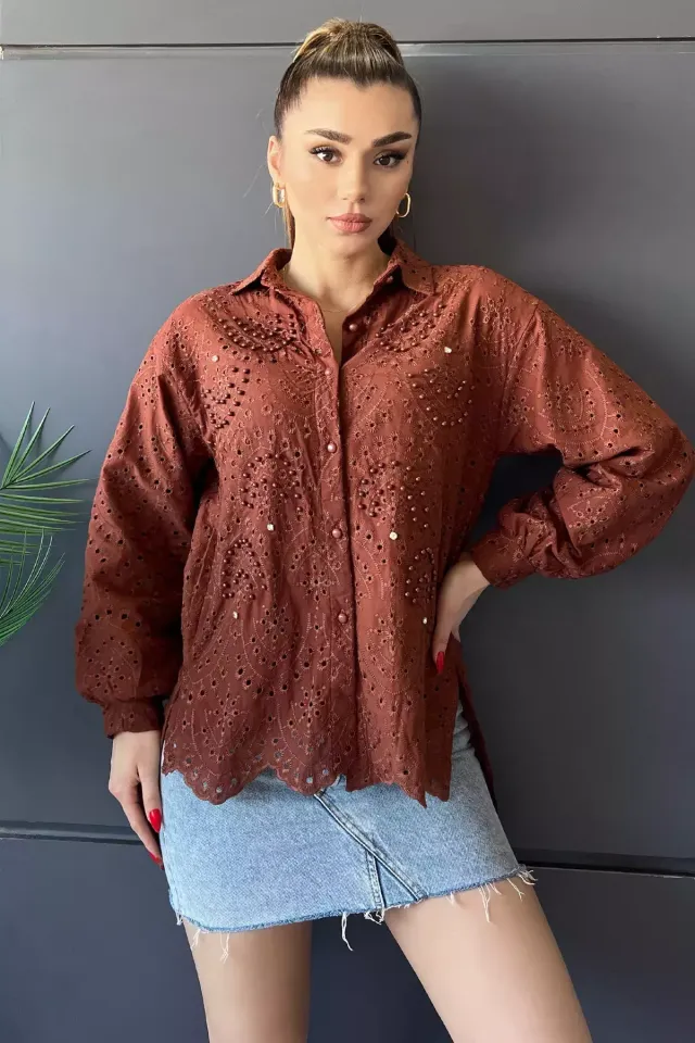 قميص كتان مزين بتفاصيل أصداف بحرية مرصعة بحجر الراين مع كتف منخفض وأزرار أمامية، قطعة ناعمة مستوحاة من الأجواء الساحلية لإطلالات عيد أنيقة.