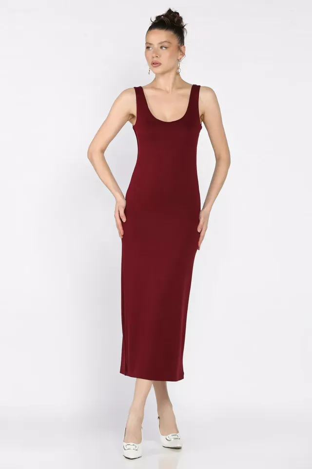فستان ميدي بقصة A وياقة U مع حمالات رفيعة، قطعة صيفية منسدلة بتفاصيل ناعمة وأناقة بسيطة.