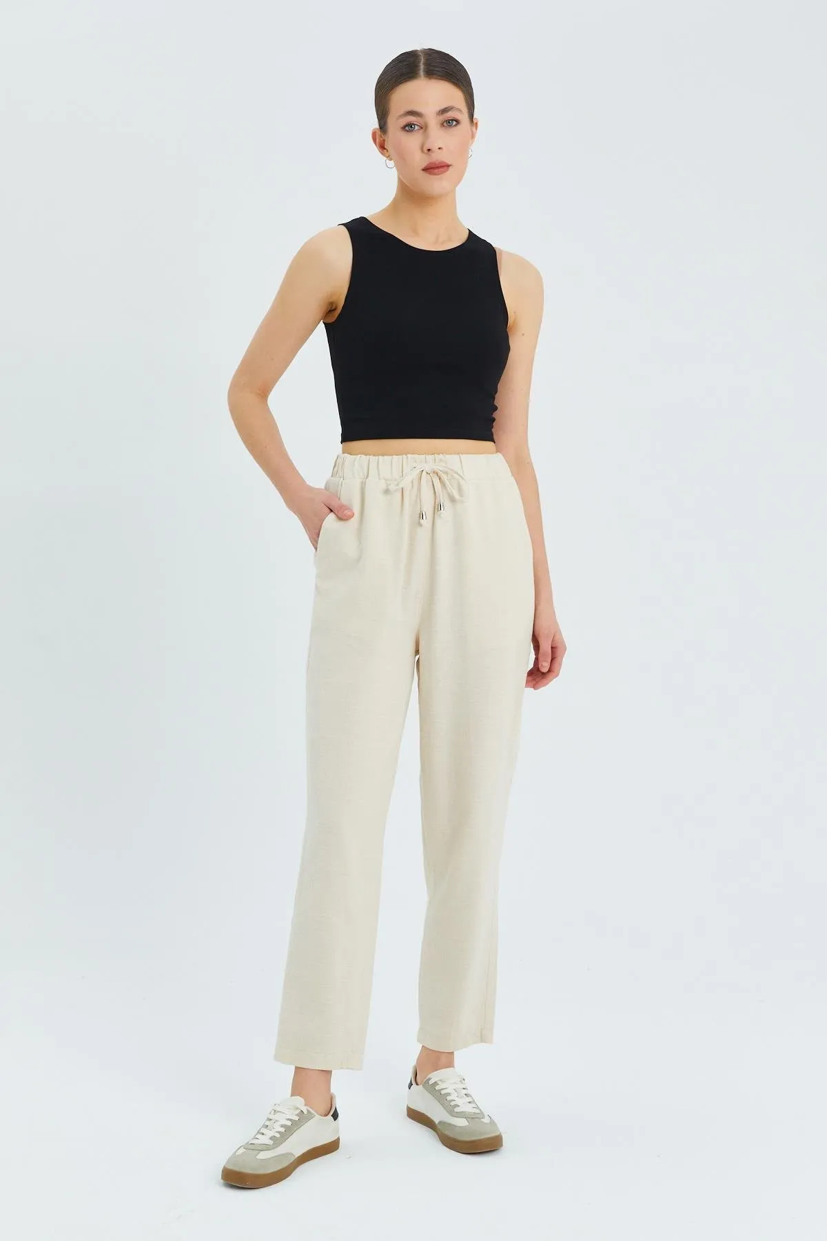 بنطال مخطط بتفصيل ربطة على الخصر وقصة خفيفة، مثالي لمشاوير العيد المنعشة.