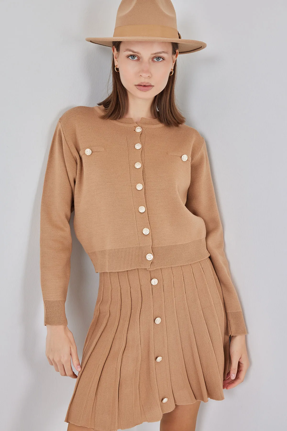طقم قطعتين توب بياقة قائمة بدون أكمام وتنورة ميني برباط خصر