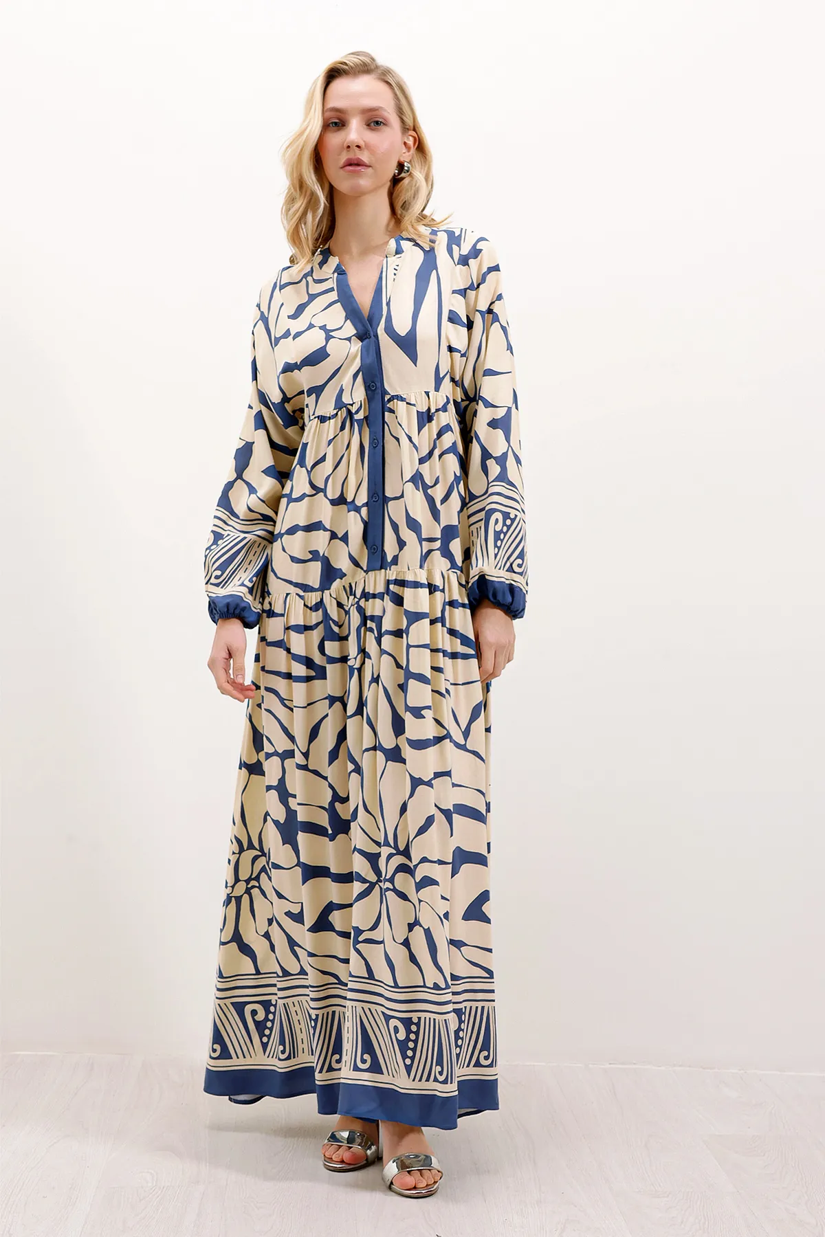 فستان ماكسي غير مبطن بقماش فيسكوز 100٪ بنقشة تراثية وأزرار أمامية، يمنحك إحساسًا مريحًا وأناقة محتشمة مثالية للأيام الدافئة أو تنسيقه بإكسسوارات ناعمة لإطلالة متجددة.