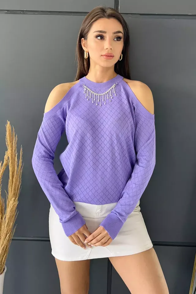 بلوزة مضلعة بياقة دائرية وتفاصيل حجرية لامعة، لمسة تألق ناعمة للإطلالات اليومية.