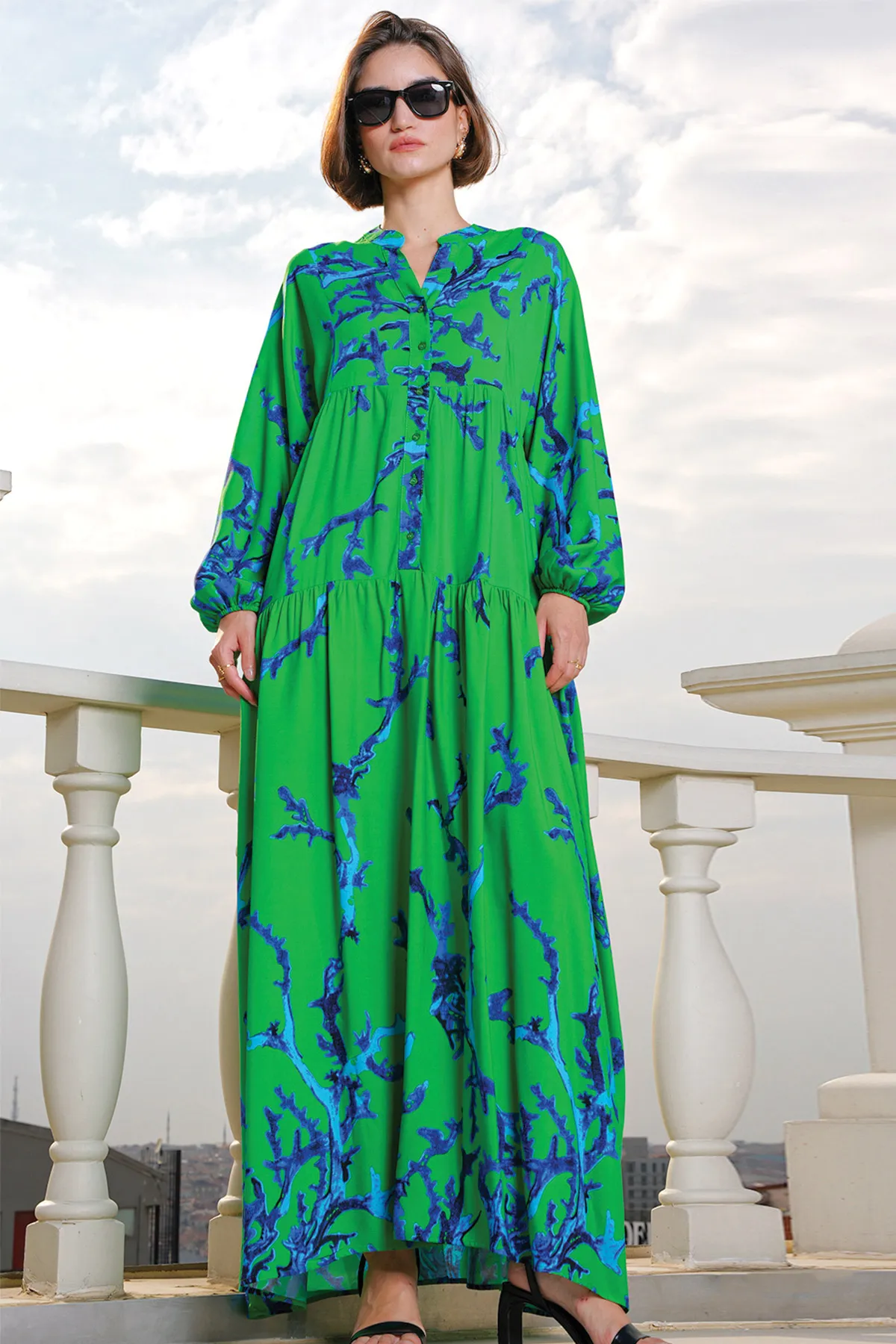 فستان نسائي طويل بوهيمي بياقة صينية وكسرات وطبقات مع أزرار أمامية