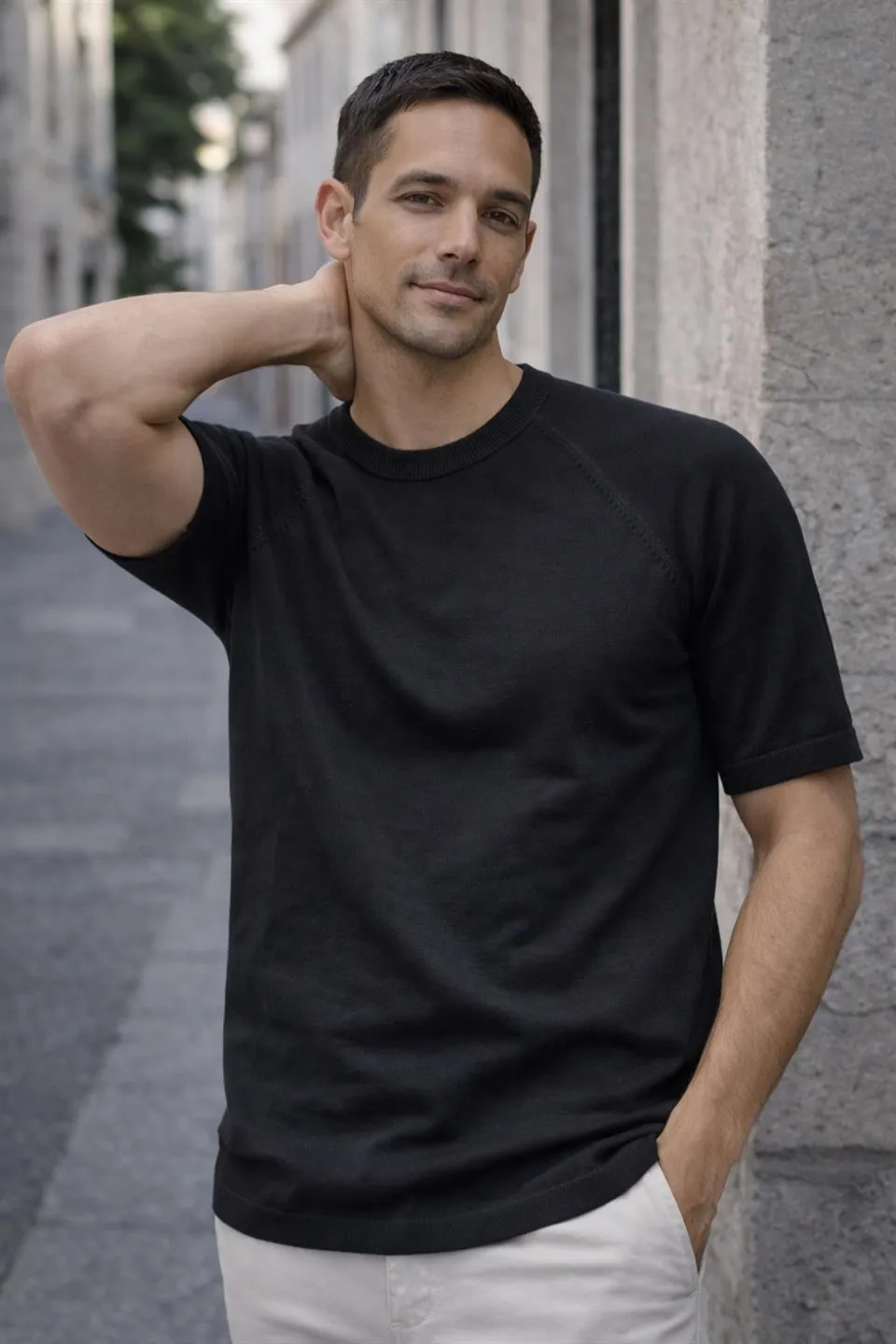 تيشيرت رجالي مخطط بأكمام قصيرة وياقة دائرية كلاسيكية، مصنوع من مزيج ناعم من البوليستر بنسبة 65% والقطن بنسبة 35%. يُغسل في الغسالة بماء بارد على درجة حرارة 30 مئوية.