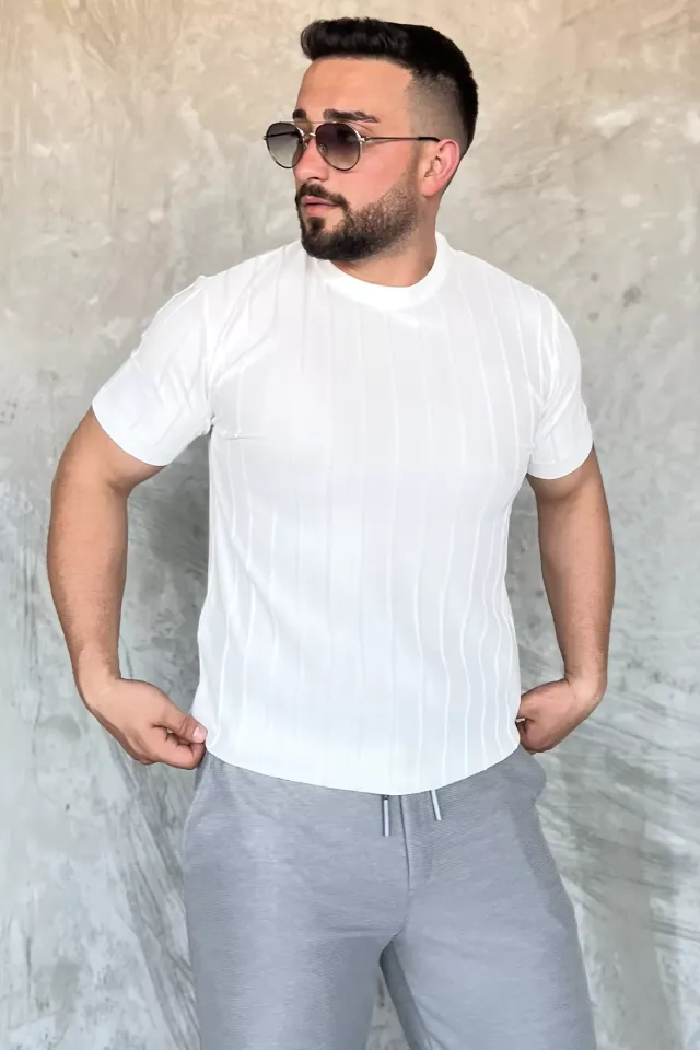 تيشيرت رجالي محبوك مضلع بأكمام قصيرة وياقة دائرية، مصنوع من 80% بولي أميد، و15% فيسكوز، و5% لايكرا. نسيج مرن وجيد التهوية. يُغسل على درجة حرارة 30 درجة مئوية.