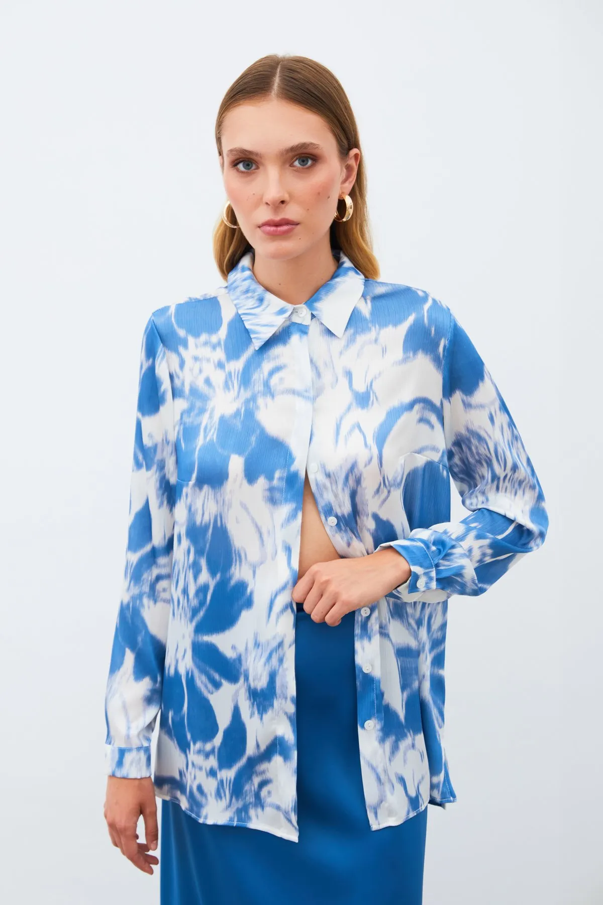 قميص جينز نسائي بأكمام طويلة وتفاصيل جيوب. خفيف الوزن وأنيق، مثالي للارتداء اليومي.