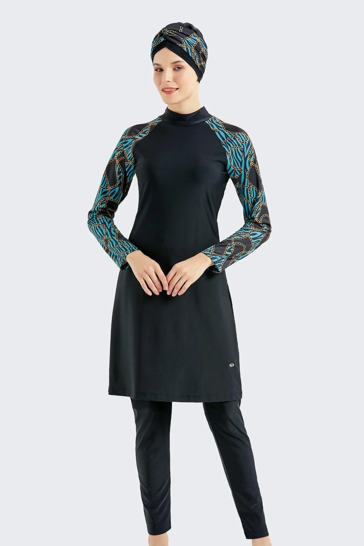 ملابس سباحة محتشمة بأكمام طويلة وتفاصيل منقوشة بنقشة مربعات، تصميم يجمع بين التغطية الكاملة والراحة والأناقة، مثالية لأيام الشاطئ، الاسترخاء بجانب المسبح، أو الأنشطة المائية بثقة.