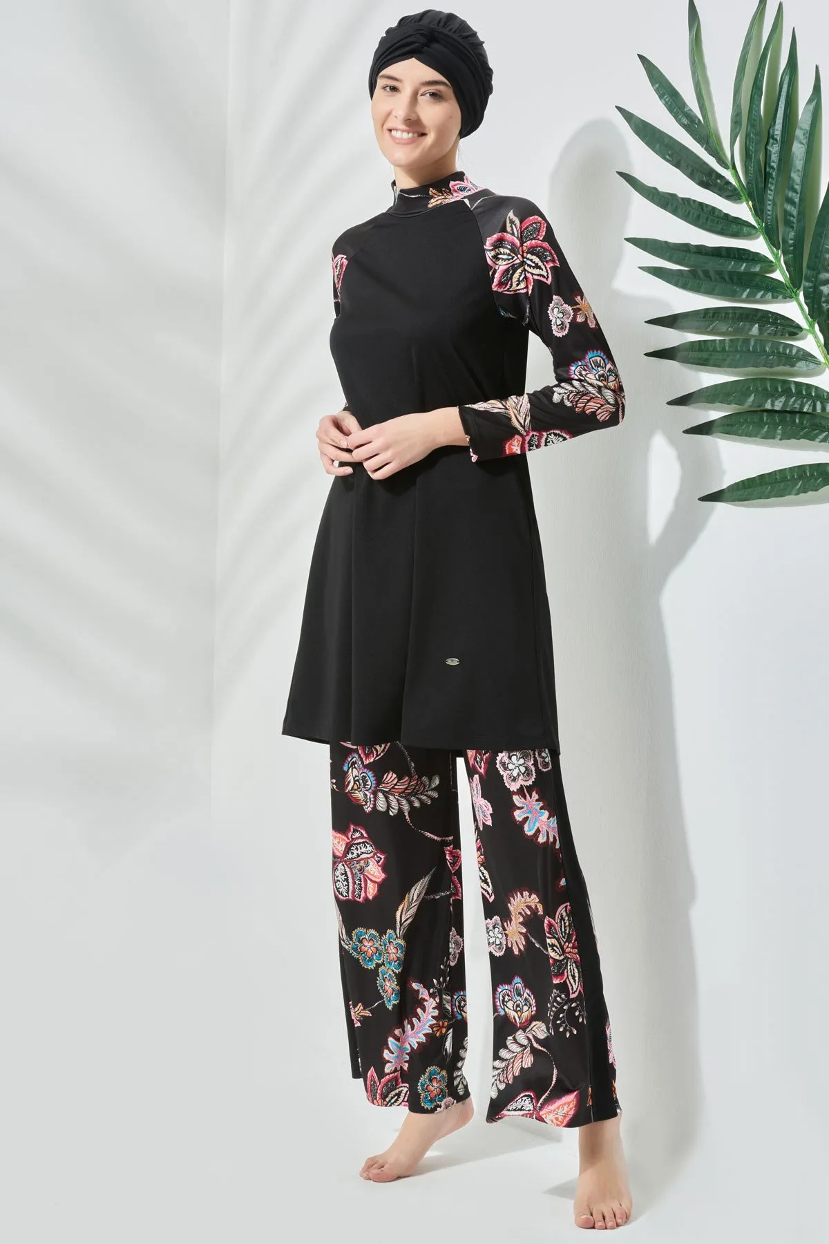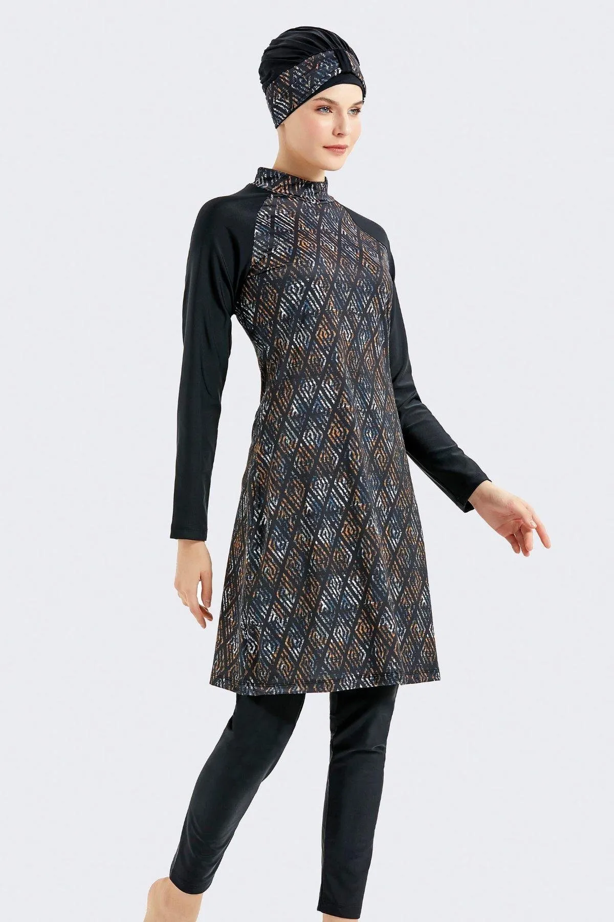 بدلة سباحة نسائية محتشمة للمقاسات الكبيرة من قماش باراشوت خفيف، بأكمام طويلة وسحاب أمامي ونقشة منقوشة، تصميم يوفر سهولة ارتداء وتغطية أنيقة، مثالية للطلعات البحرية أو الاسترخاء بجانب المسبح.