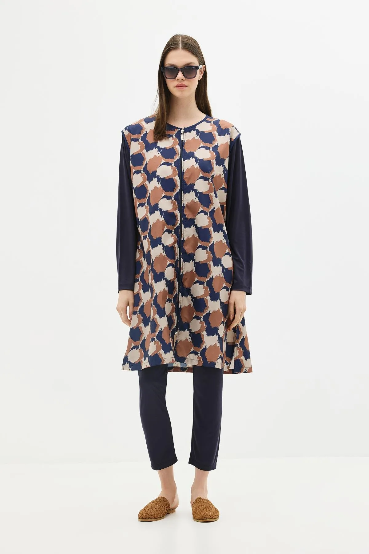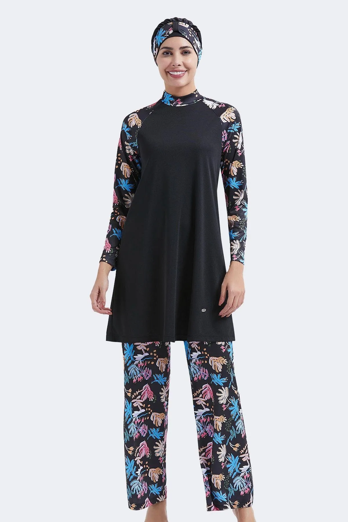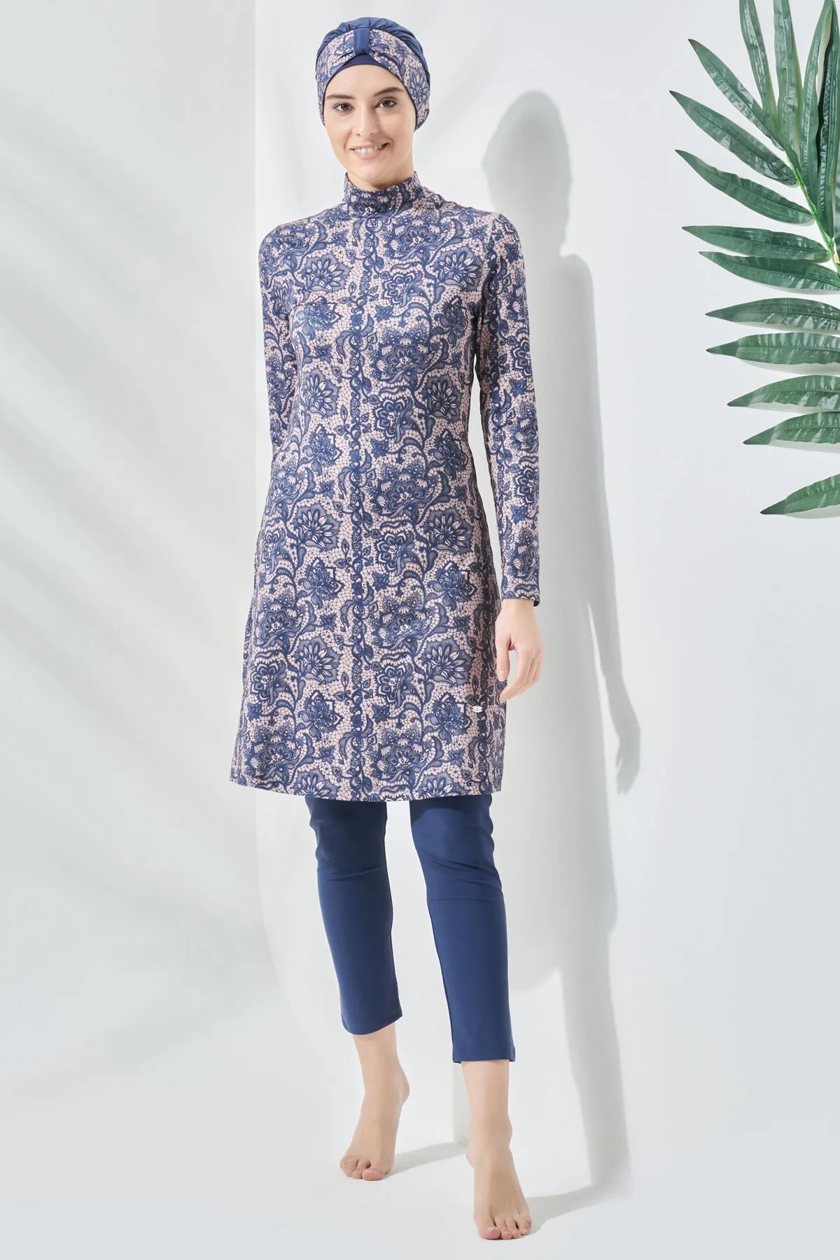 ملابس سباحة نسائية محتشمة منقوشة بأكمام طويلة وتفاصيل طيات مع قصة مريحة، تصميم مثالي لأيام الشاطئ المريحة، الاسترخاء بجانب المسبح، أو اللحظات المائية النشيطة بسهولة.