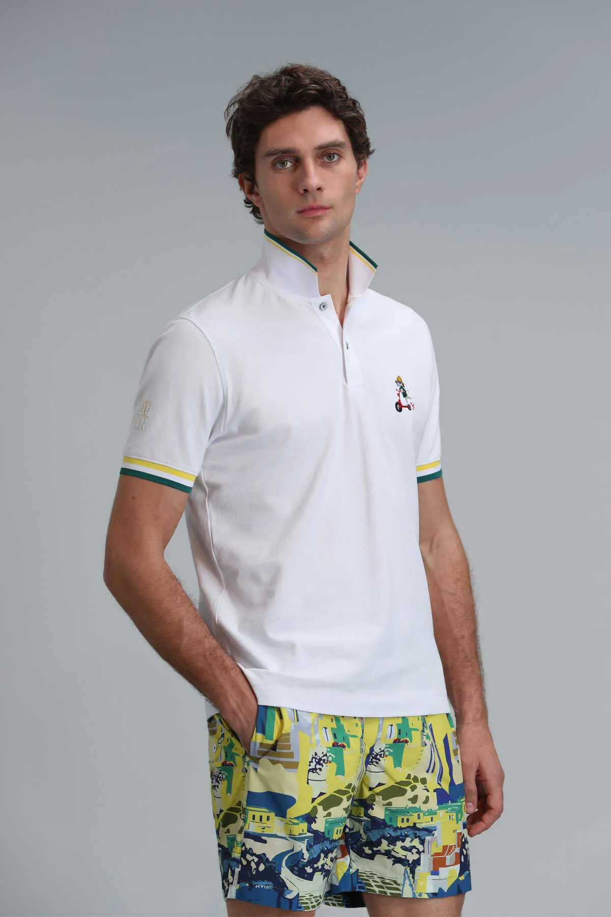 طقم رجالي بياقة دائرية وأكمام قصيرة مع بنطلون بقصّة مستقيمة ورباط