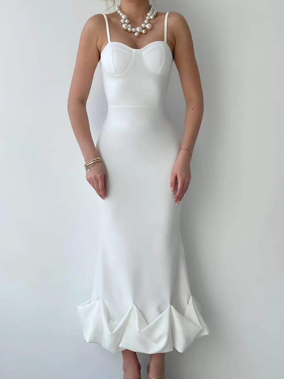 كوني محط الأنظار في العيد مع فستان ميدي أنيق بياقة متدلية وطيات عند الصدر وحمالات رفيعة وشق جانبي للنساء.