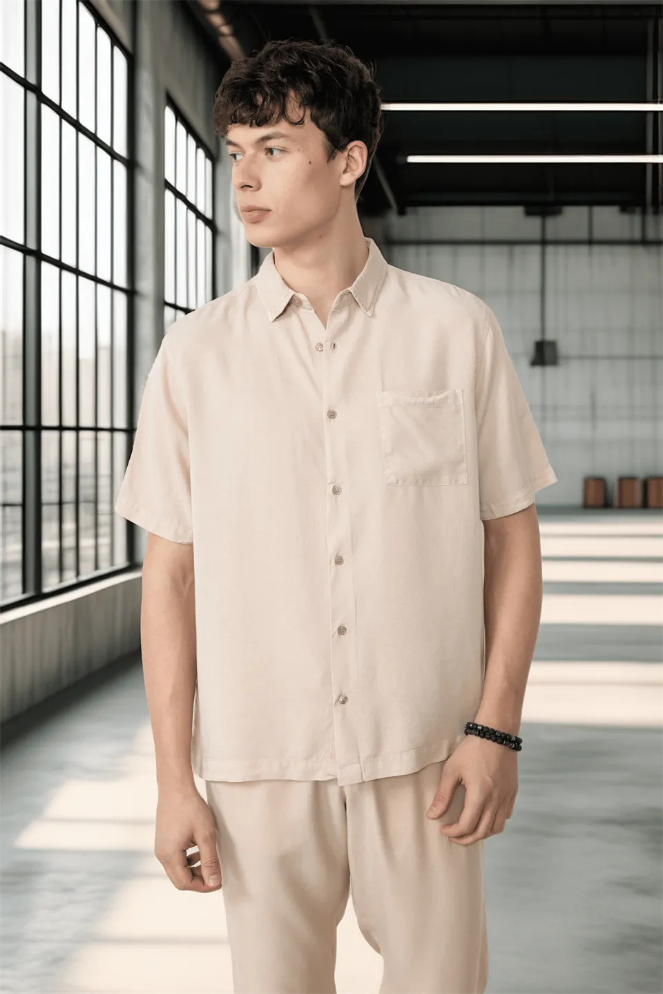 طقم رجالي من بلوزة وشورت بفتحة رقبة على شكل حرف V، مصنوع من قطن ١٠٠٪ لراحة فائقة. أكمام قصيرة وأزرار أنيقة تمنح مظهرًا كاجوال. قابل للغسل في الغسالة على درجة حرارة ٤٠ درجة مئوية.