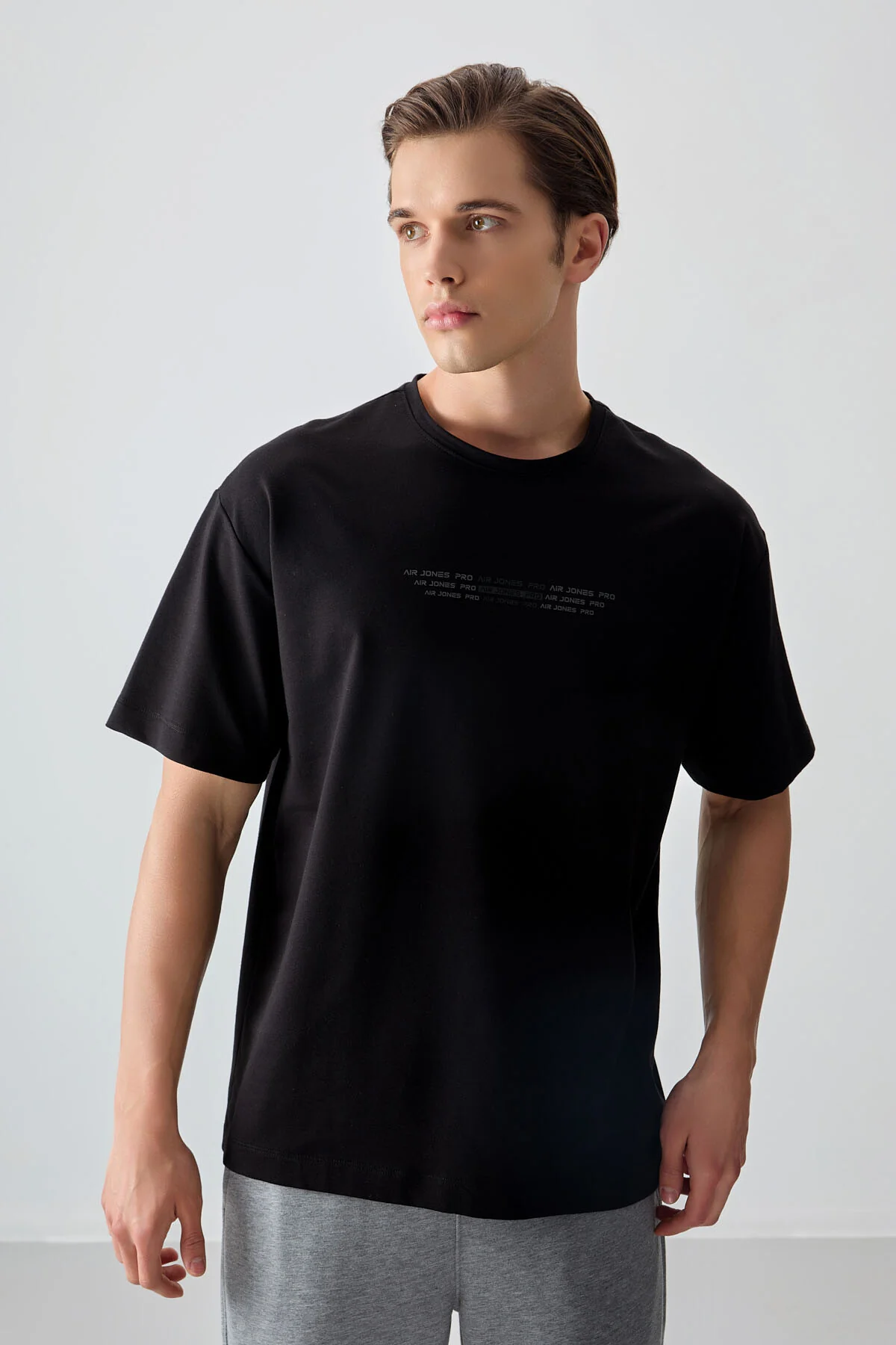 تيشيرت رجالي مطبوع بأكمام ثلاثة أرباع وكتف منسدل. مصنوع من قطن ١٠٠٪ للراحة والتهوية. يُغسل على درجة حرارة ٣٠ درجة مئوية.