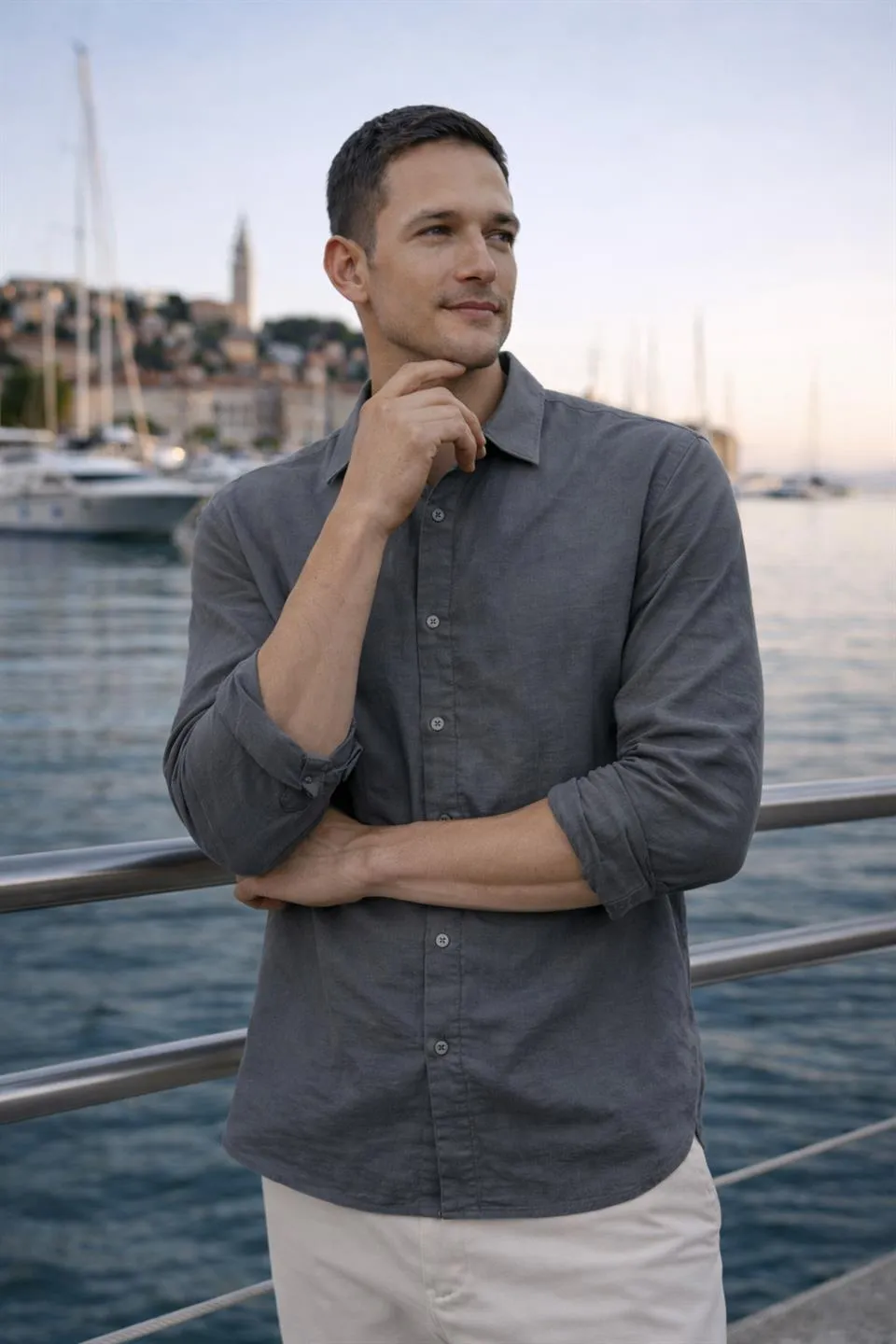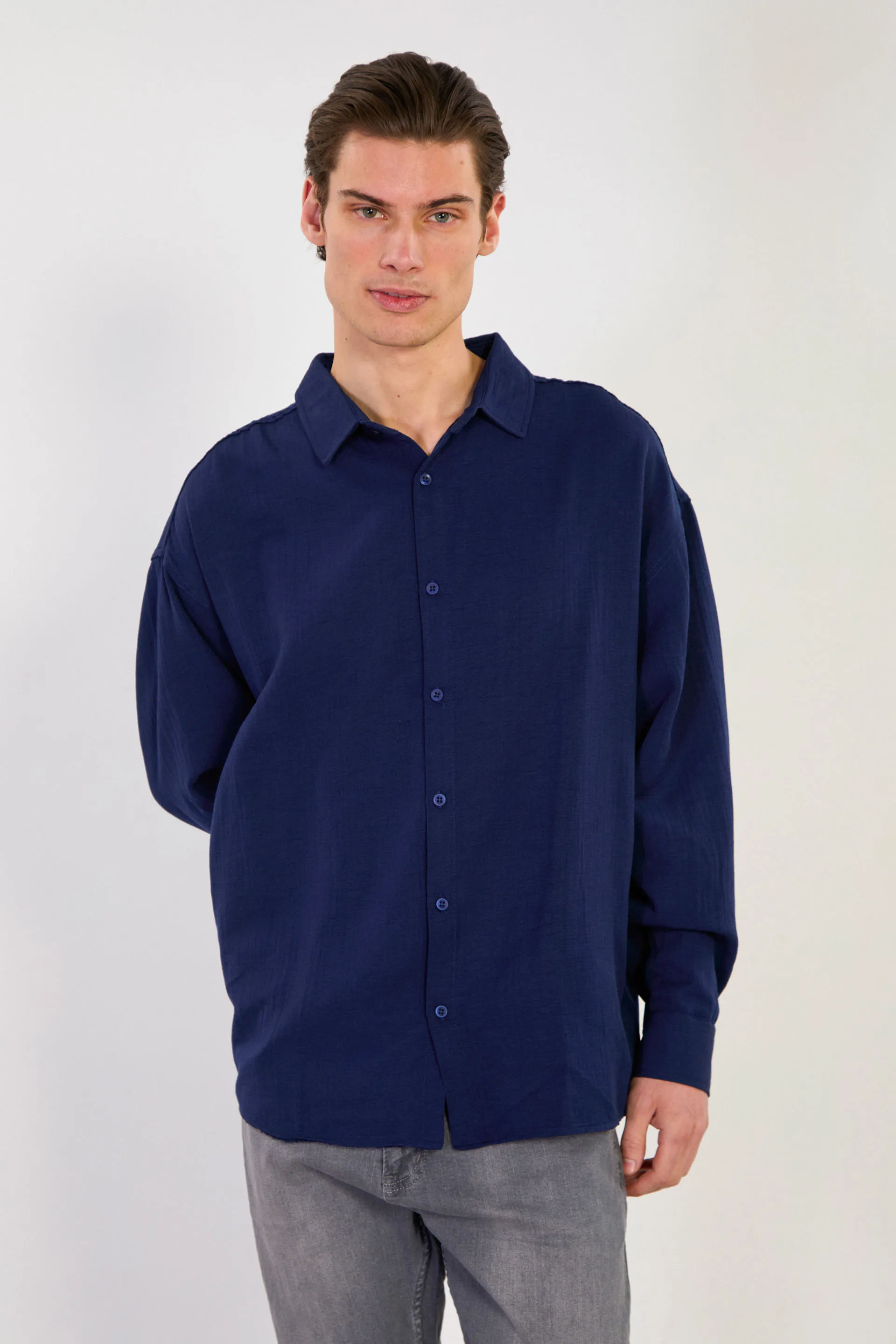 قميص رجالي بأكمام طويلة وياقة قميص، مصنوع من قطن ناعم ١٠٠٪ لراحة وأناقة مثالية طوال اليوم. مزود بأزرار لسهولة الارتداء. قابل للغسل في الغسالة على درجة حرارة ٤٠ درجة مئوية.