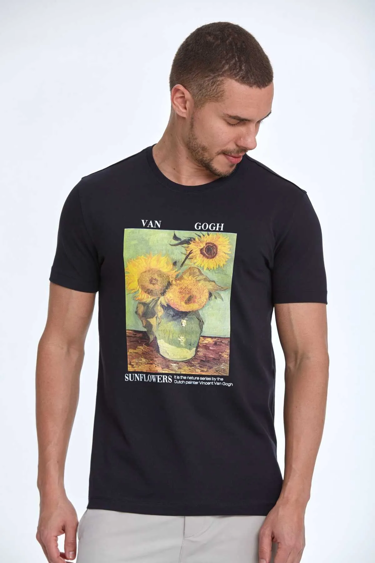تيشيرت رجالي مطبوع بكتف منسدل وياقة دائرية وقصة مريحة. مصنوع من قطن ١٠٠٪ لنعومة فائقة وتهوية جيدة. يُغسل على درجة حرارة ٣٠ درجة مئوية.