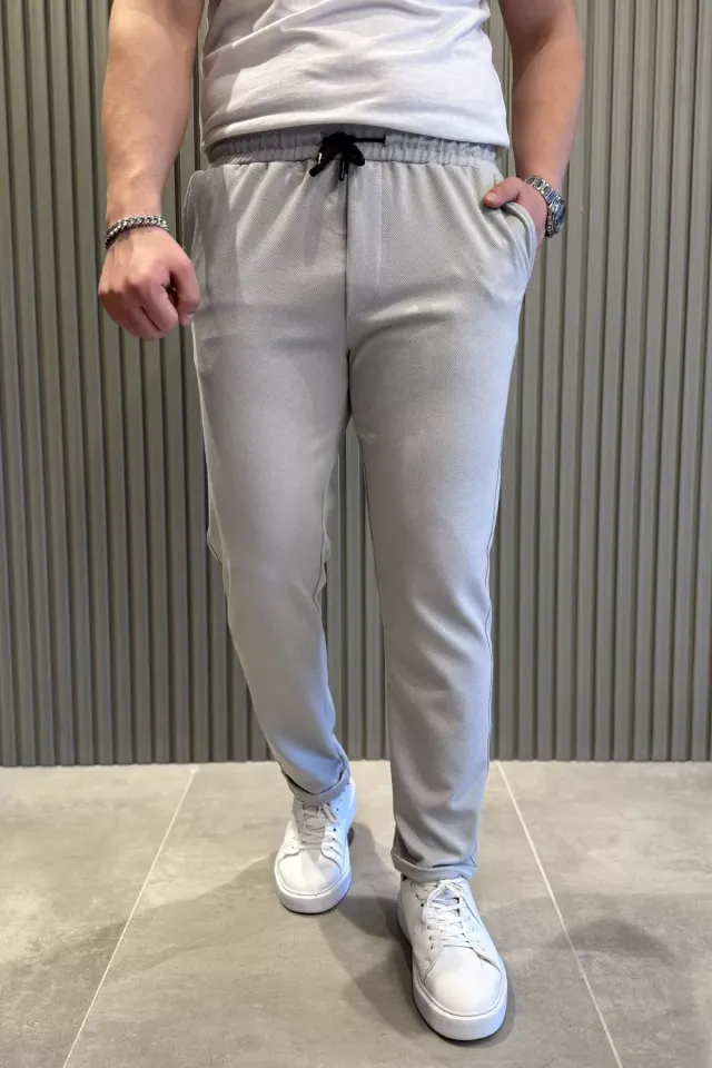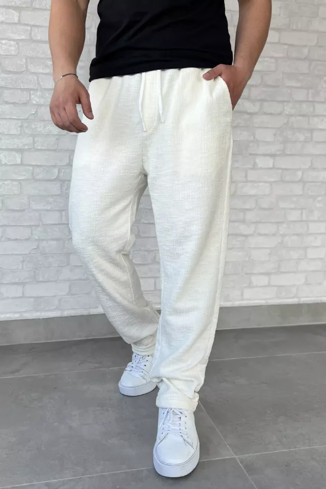 بنطلون رجالي بقصّة مستقيمة مع خصر مرن برباط، مصنوع من قطن ١٠٠٪ لراحة فائقة ونعومة طبيعية. قابل للغسل على درجة حرارة ٤٠ درجة مئوية، مثالي للارتداء اليومي المريح.