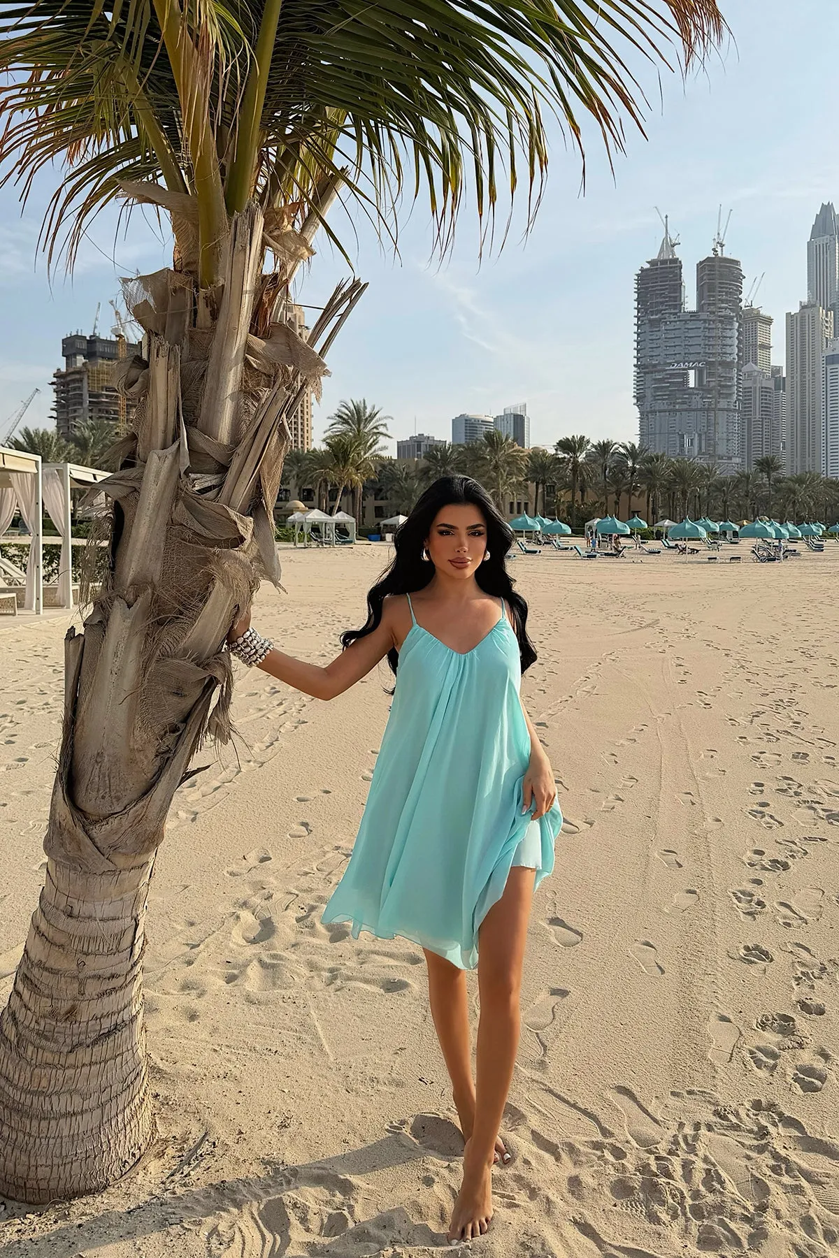 فستان طويل بقصة كلوش أمامية منسدلة وتنورة بكسرات بقماش بوليستر خفيف، مثالي لإطلالات الصيف والإجازات الأنيقة للنساء.