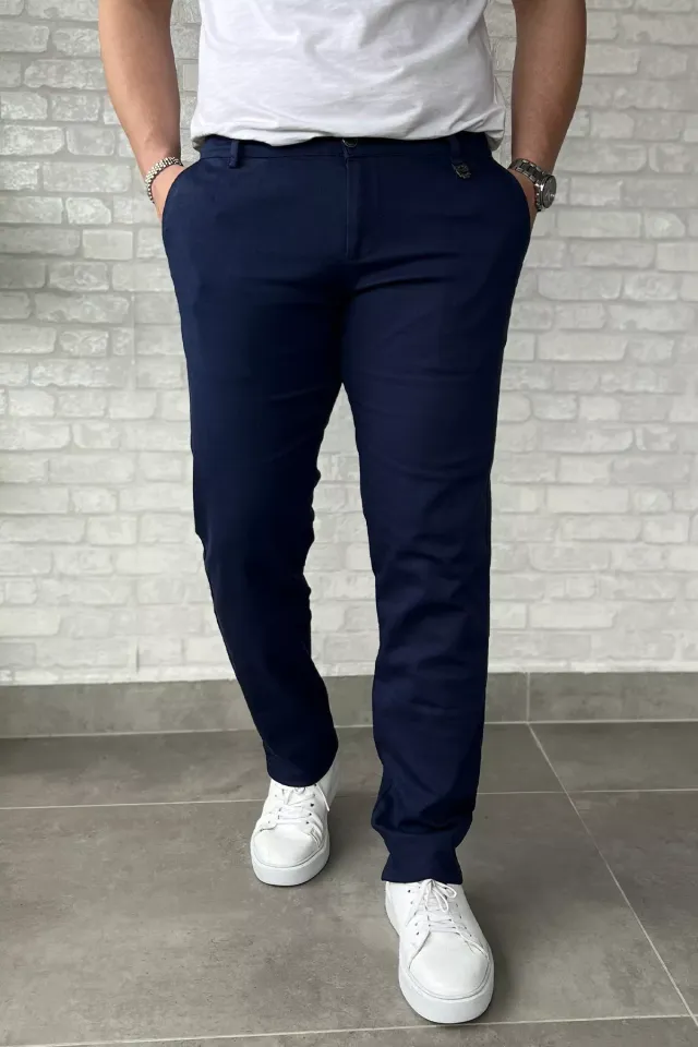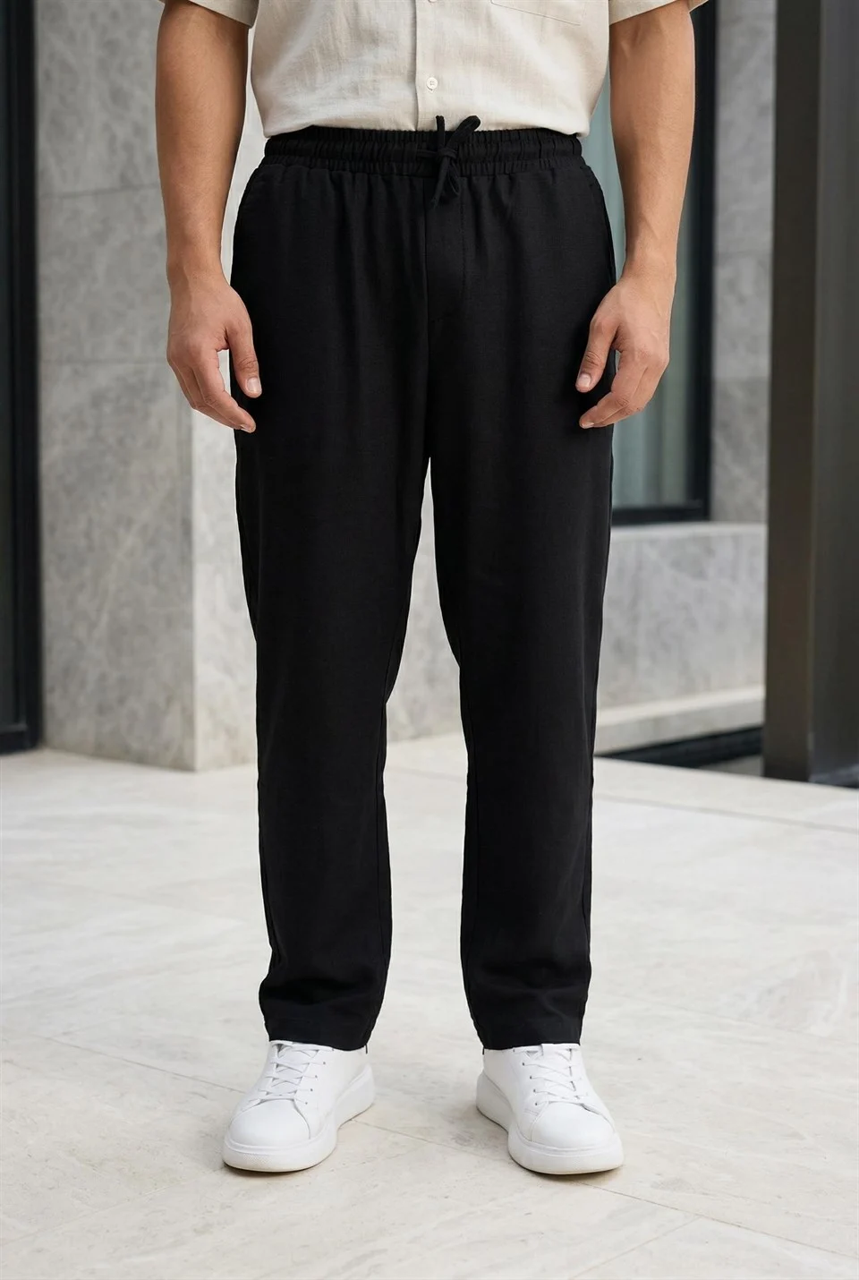 بنطال رجالي بقصّة "مام فيت" مع خصر برباط، مصنوع من قطن ١٠٠٪ لراحة فائقة وناعمة. يتميز بقصّة مريحة مثالية للارتداء اليومي. قابل للغسل على درجة حرارة ٤٠ درجة مئوية، مثالي للاستخدام اليومي.