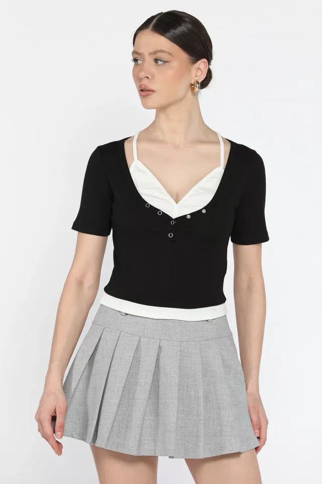 توب كروب نسائي بياقة هالتر وظهر مكشوف، قصة ضيقة وأناقة جريئة للعيد والصيف.