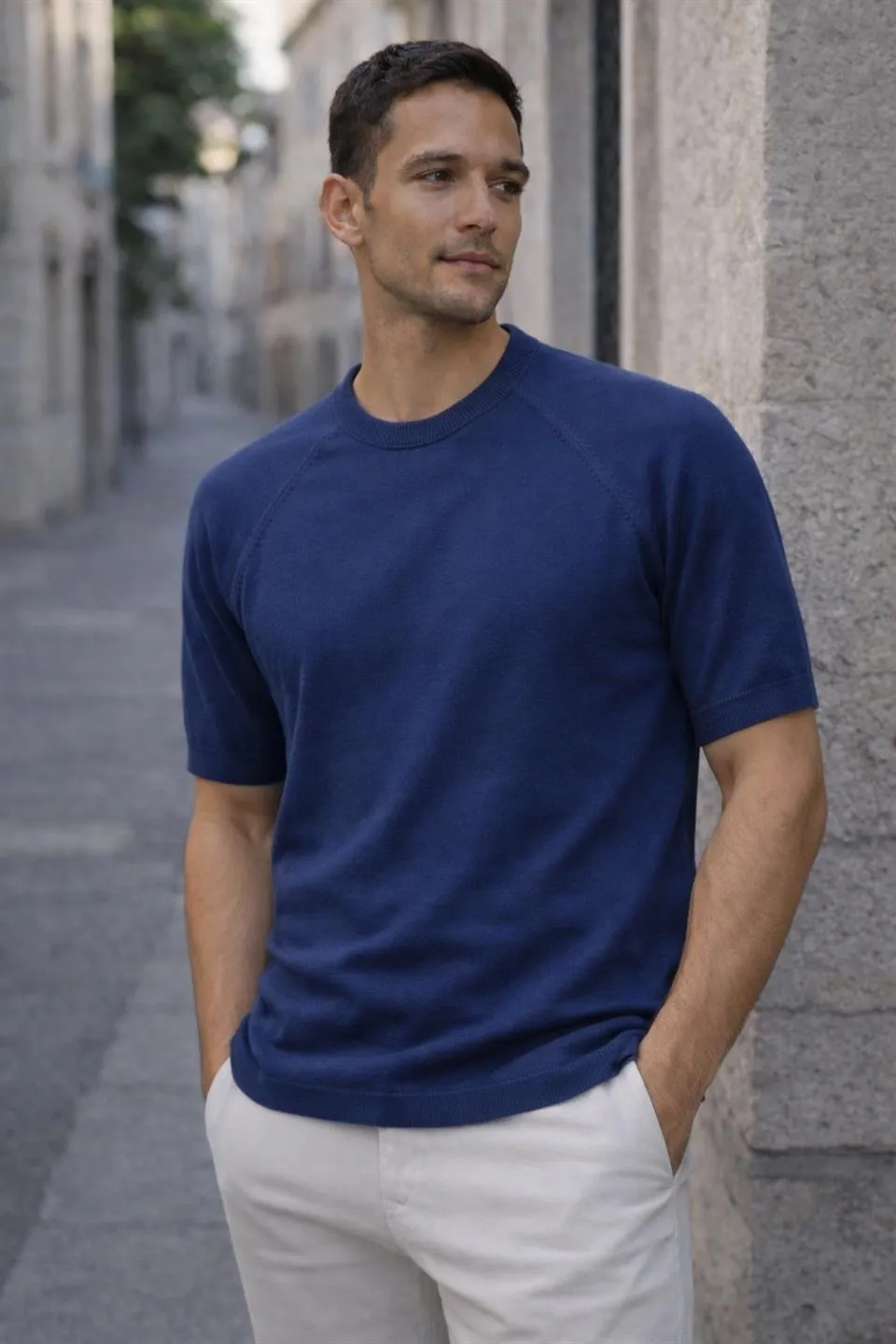 تيشيرت رجالي بقصّة عادية، مصنوع من قماش قطني ناعم ومريح ١٠٠٪. يُغسل على درجة حرارة ٣٠ درجة مئوية.
