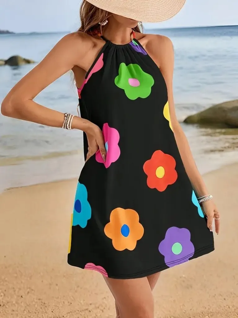 فستان ساتان قصير بكتف واحد وتنورة كلوش مخططة مع ربطة خصر للنساء