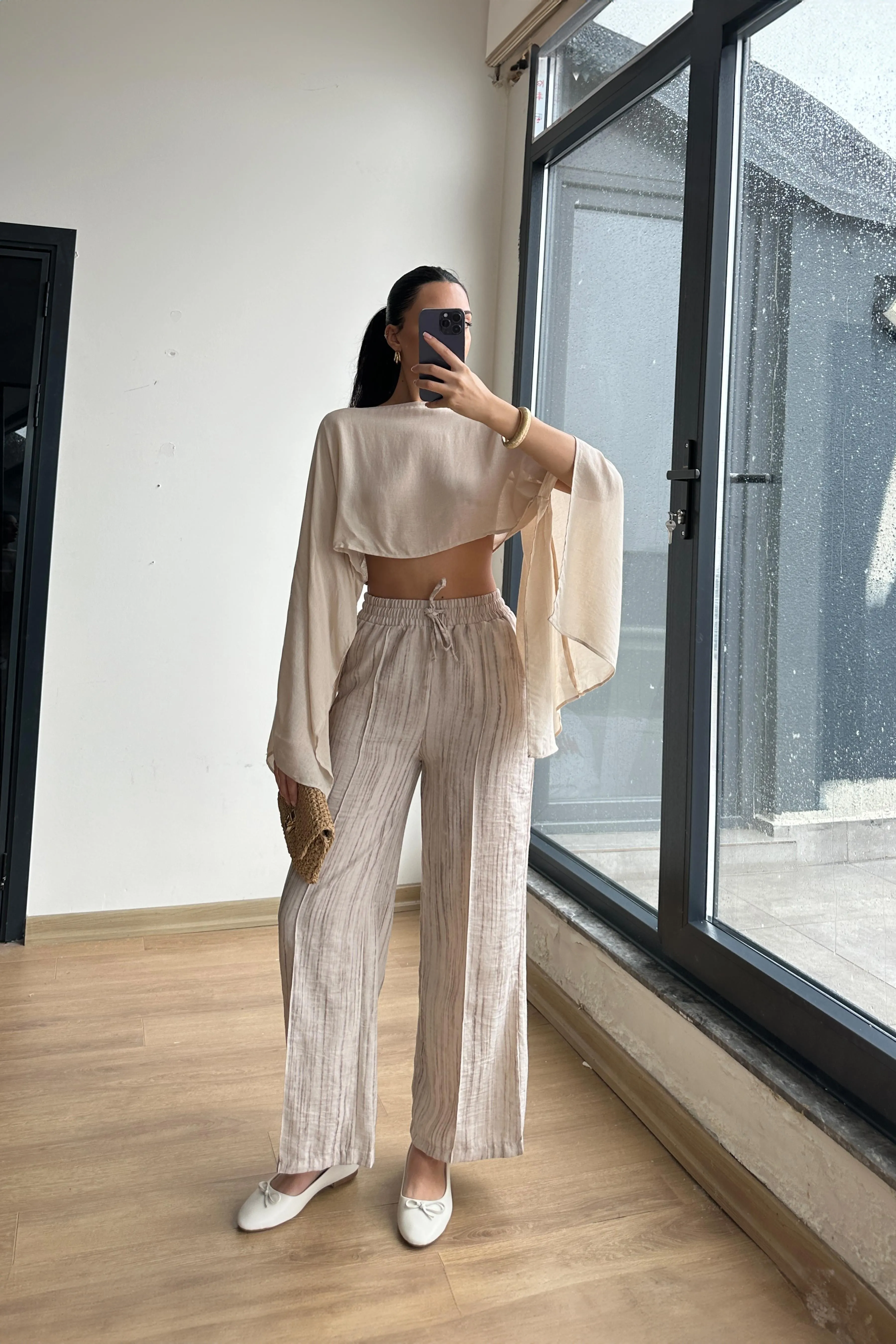 بنطلون واسع بخصر مطاطي مخطط بيج، راحة وأناقة صيفية للعيد والعطلات للنساء.