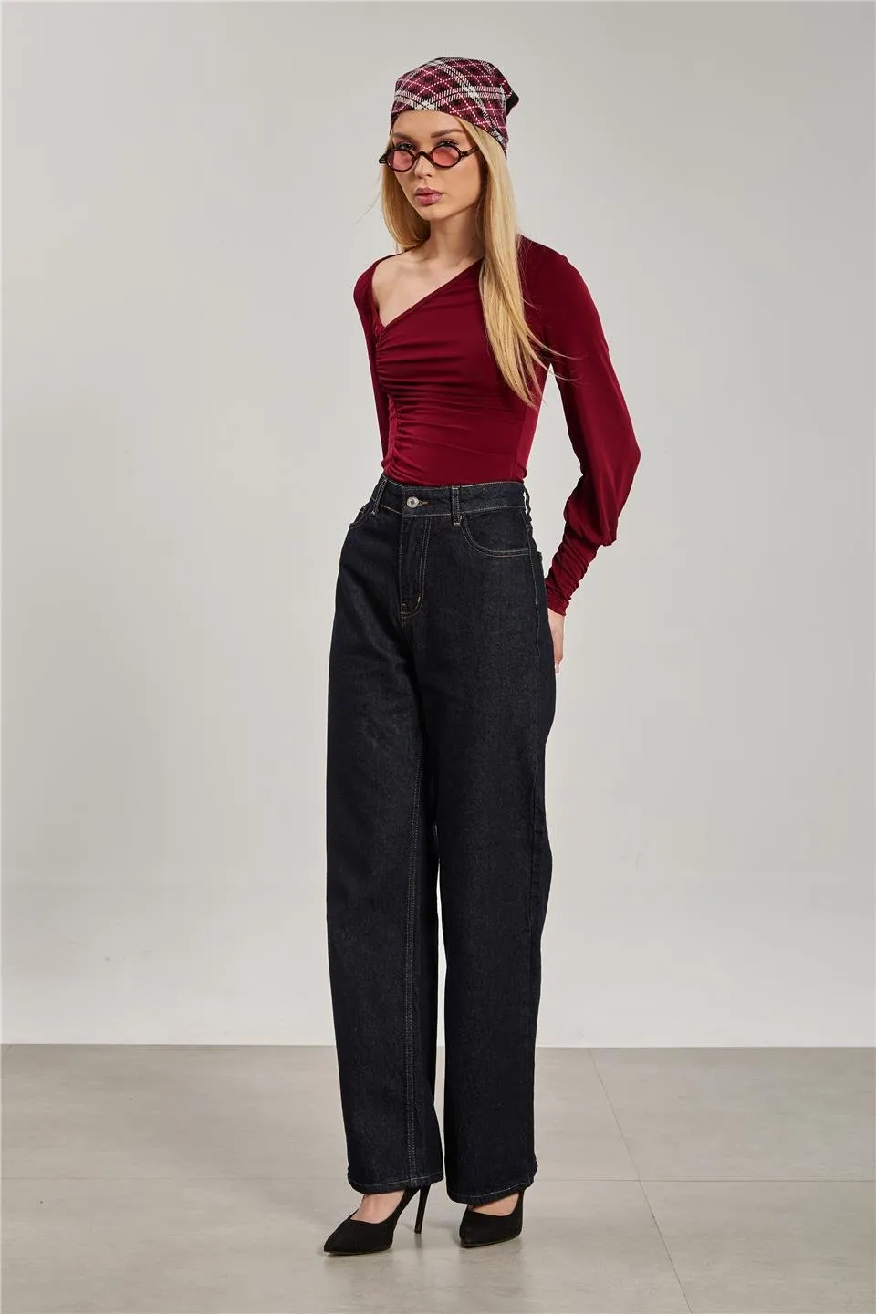 بنطلون جينز بخصر عالٍ وقصة مستقيمة واسعة مع أطراف مهدبة لإطلالة يومية مريحة وعصرية