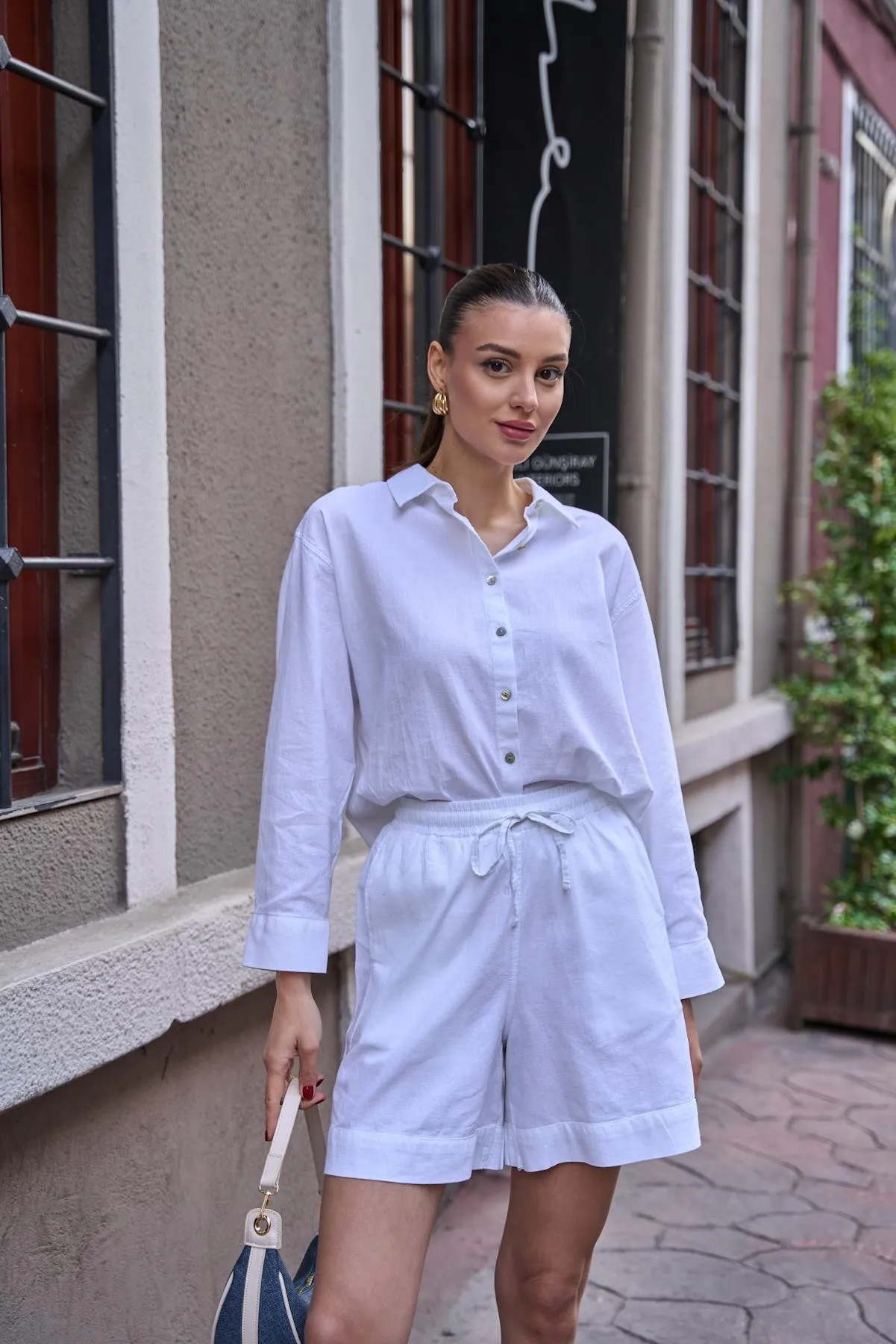 شورت كتان بخصر عالٍ، مصمم لأيام الصيف المنعشة. خفيف الوزن وأنيق، مثالي للارتداء اليومي المريح. قابل للغسل في الغسالة على درجة حرارة 30 درجة مئوية.