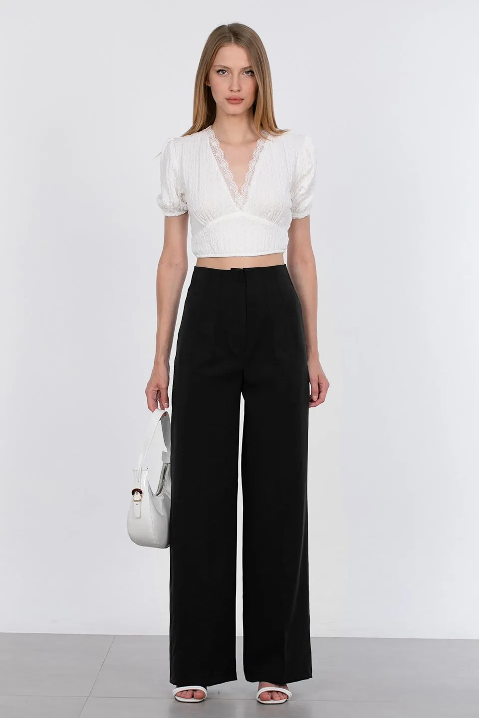 بنطلون بالازو نسائي كتان بخصر عالي واسع الساقين، راحة وأناقة عصرية للصيف والعيد واليوميات.