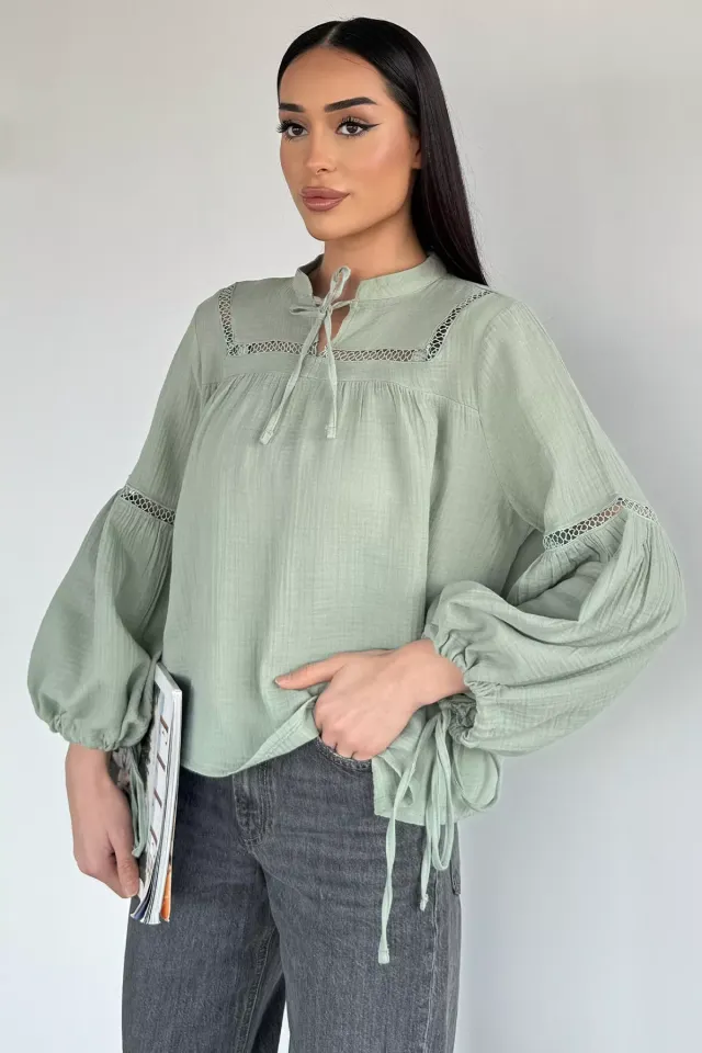 محتوى المنتج: بوليستر ١٠٠٪. مميزات المنتج: بلوزة بياقة مادونا وتفاصيل فراشة. معلومات الموديل: المقاس: ٣٨. ارتفاع المنتج: ٣٤ سم. قياسات الموديل: الارتفاع: ١٧٦. الصدر: ٩٠. الخصر: ٦٣. الورك: ٩٤. تعليمات الغسيل والاستخدام العامة: • يجب غسل المنتجات المصنوعة يدويًا والمطرزة بالخرز مقلوبة على دورة غسيل رقيقة. • قد تتساقط الأقمشة المطبوعة مع مرور الوقت. • لا تتجاوز درجة الحرارة ٣٠ درجة مئوية لمنع تلف المنتج أثناء الغسيل. • اغسل المنتج وفقًا لتعليمات الغسيل. • استخدم منظفًا مناسبًا للمنتجات الملونة. • قد تتصبغ منتجات الدنيم والمنتجات ذات الألوان الداكنة عند غسلها مع منتجات أخرى فاتحة اللون. لا تغسلها معًا. • لا تعرض الملابس لأشعة الشمس المباشرة أثناء التجفيف.