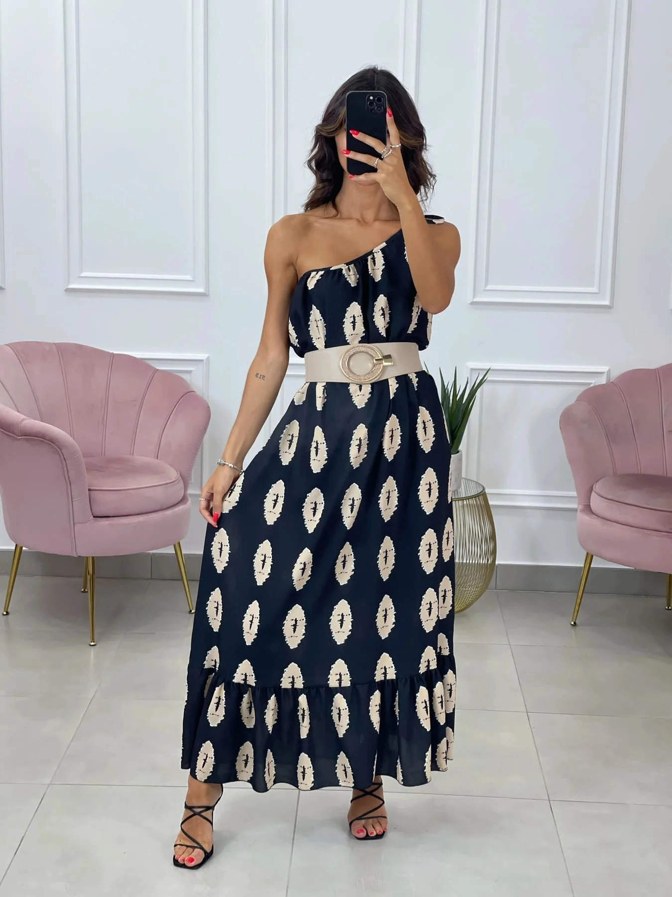 فستان ميدي بقصة غير متماثلة وياقة V وحمالات وتفصيل حلقة معدنية للنساء