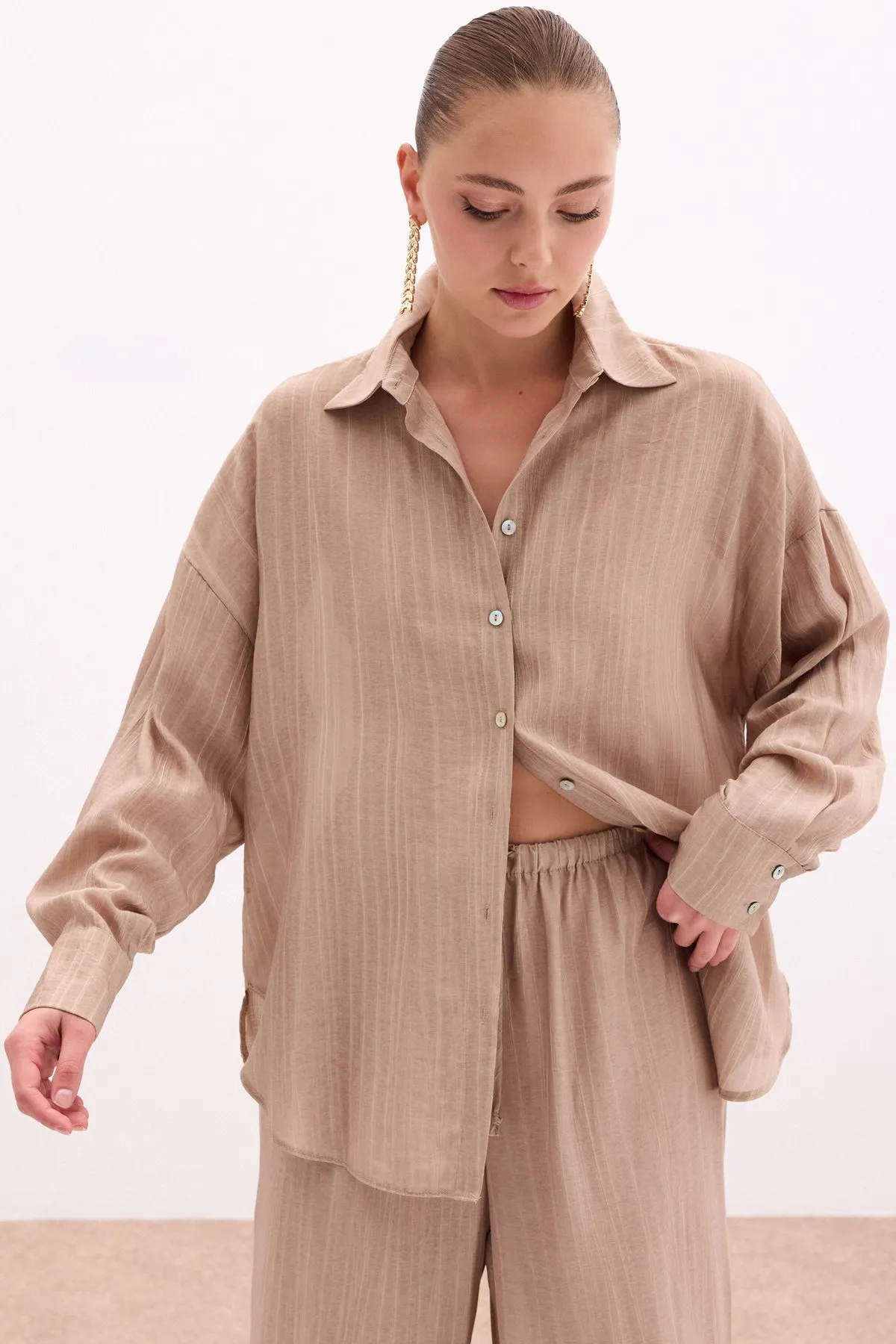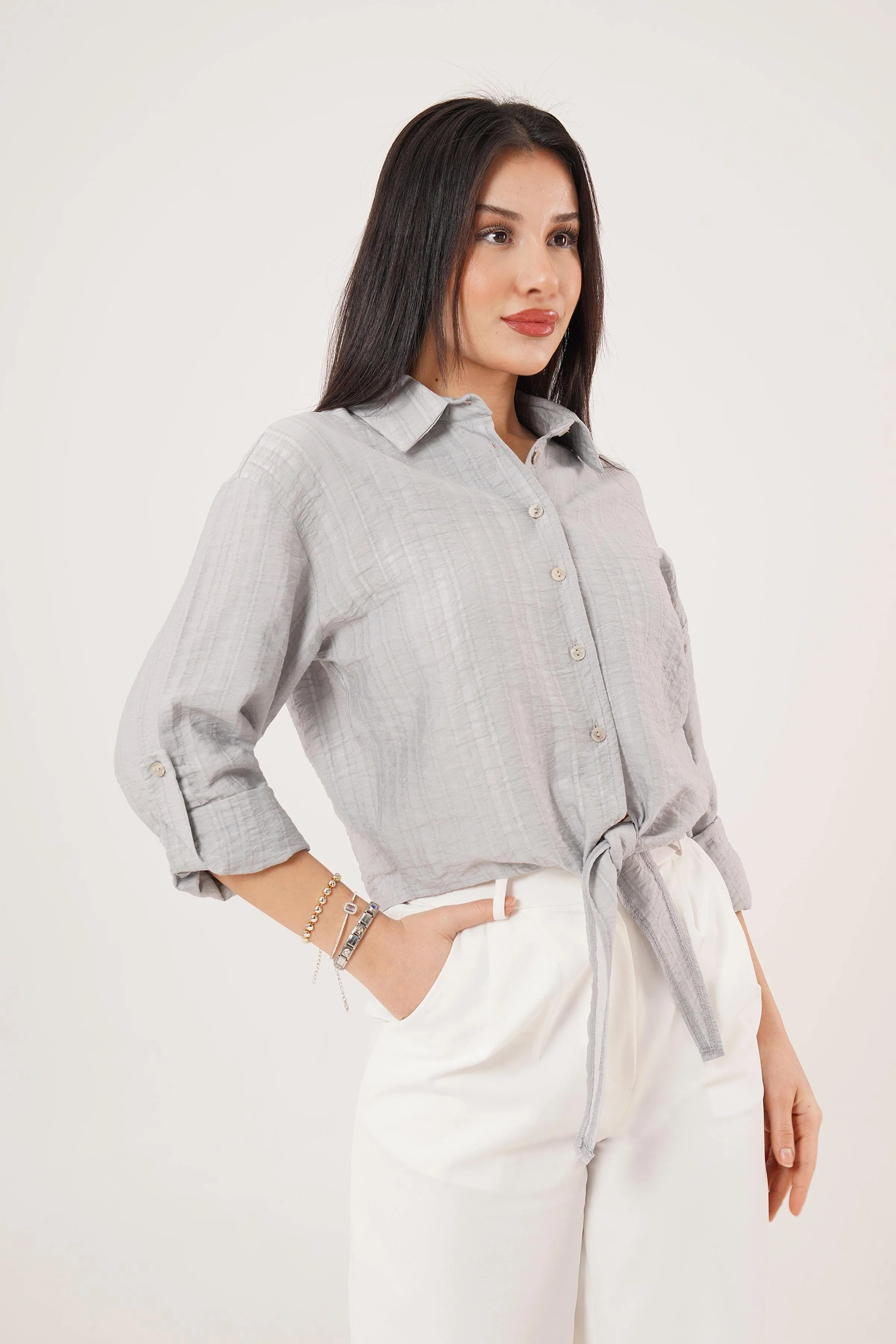 قميص نسائي مخطط بأكمام طويلة، بتفاصيل أنيقة وأشرطة تُضفي لمسة عصرية. تصميم مريح وأنيق، مثالي للإطلالات اليومية والموسمية، في الأجواء المعتدلة والدافئة.