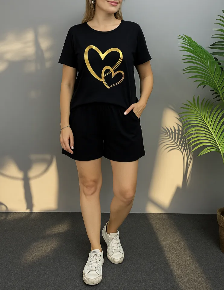 صباح بطيء وفنجان قهوة بيدك، وهذا الطقم بطبعة مرحة وتيشيرت بأكمام قصيرة مع شورت يحافظ على خفتك وأناقتك، مثالي ليوم بالبيت أو مشوار سريع أو جلسة استرخاء.