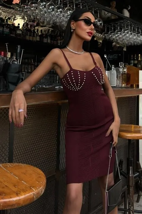 فستان نسائي طويل بقصة ضيقة بحمالات رفيعة وقماش دالغيتش مع تفاصيل دانتيل، تصميم جريء وأنيق للعيد والإطلالات اليومية.