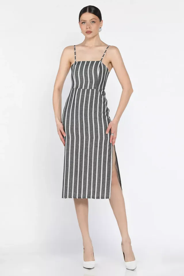 فستان نسائي طويل بقصة ضيقة بدون أكمام مع شق جانبي وفتحة وحزام سلسلة