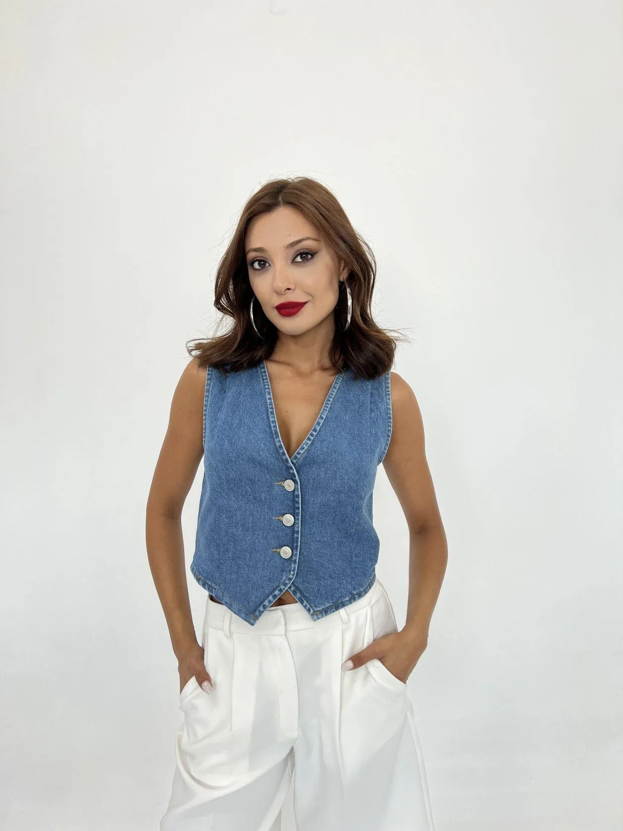 فيست جينز قصير بياقة V وجيب أمامي قطعة أساسية لإطلالات صيفية وعيد عصرية