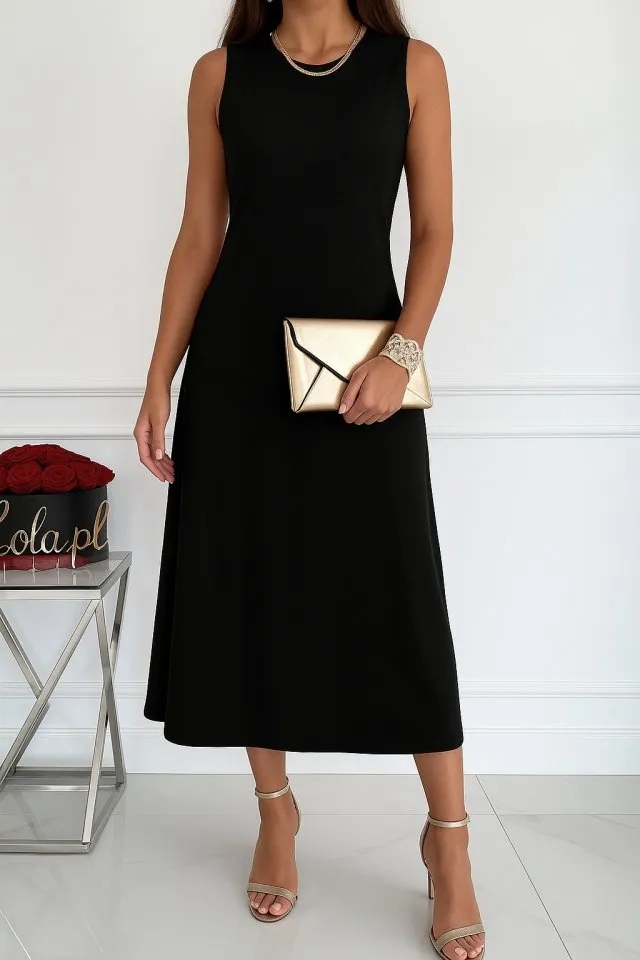 فستان نسائي بطول الركبة بقصة ضيقة وتنورة بكسرات وصدر مزدوج مع حمالات رفيعة