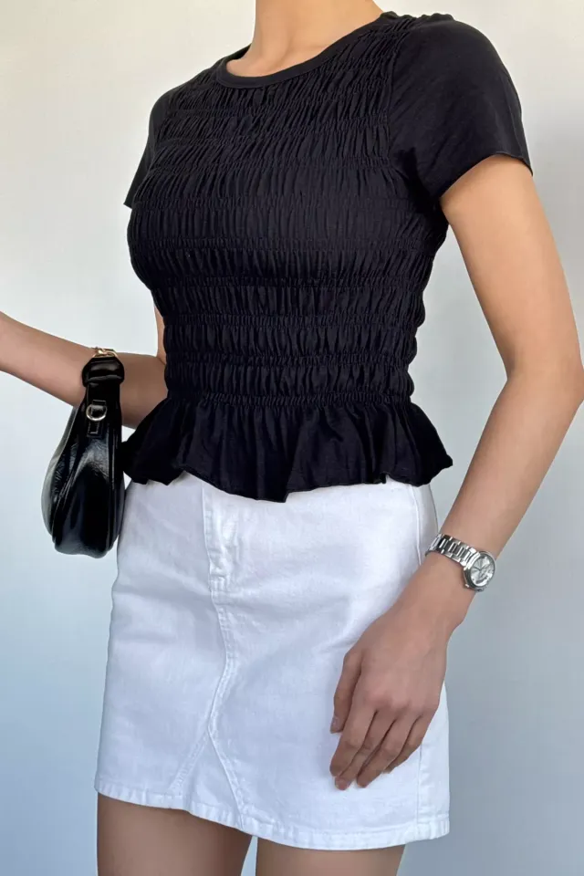 بلوزة بنقشة زهور مخططة بأكمام بالون قصيرة وياقة دائرية وقصة مريحة، خيار عملي للعيد والصيف.
