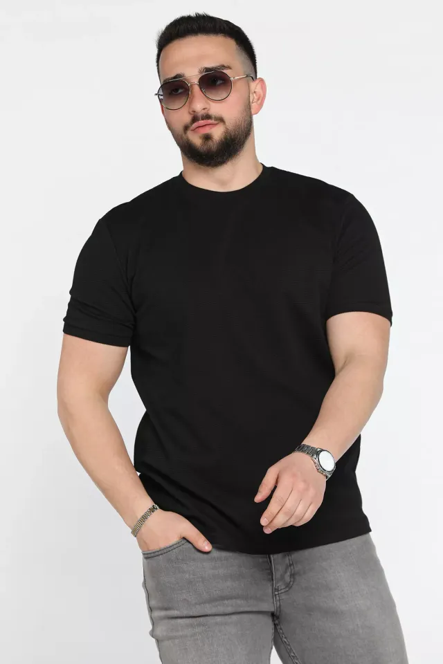 تيشيرت رجالي محبوك بتصميم جرافيكي عصري، مصنوع من ٦٥٪ قطن، ٢٨٪ بولي أميد، و٧٪ إيلاستين. ناعم، أنيق، ومريح. يُغسل على درجة حرارة ٤٠ درجة مئوية.