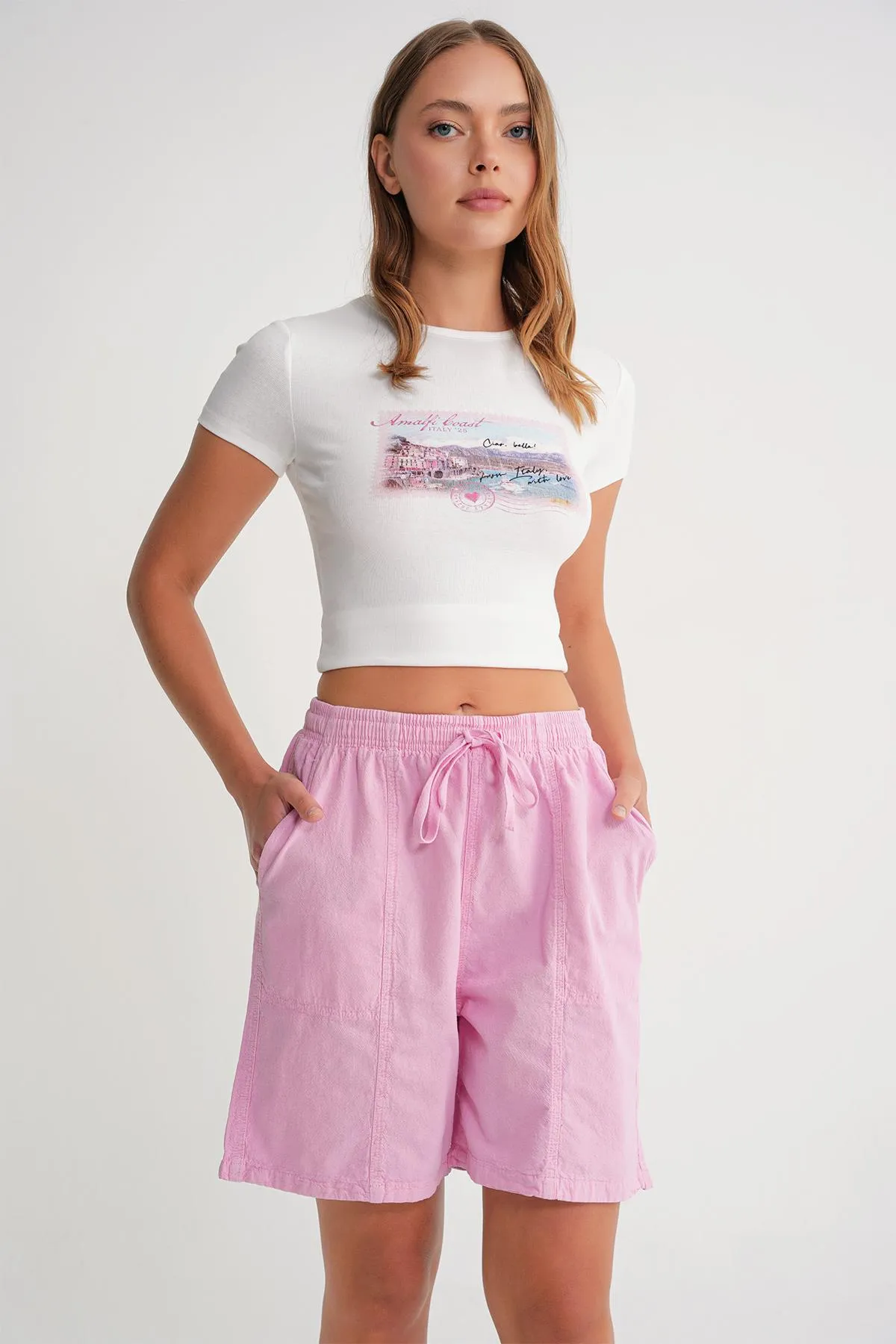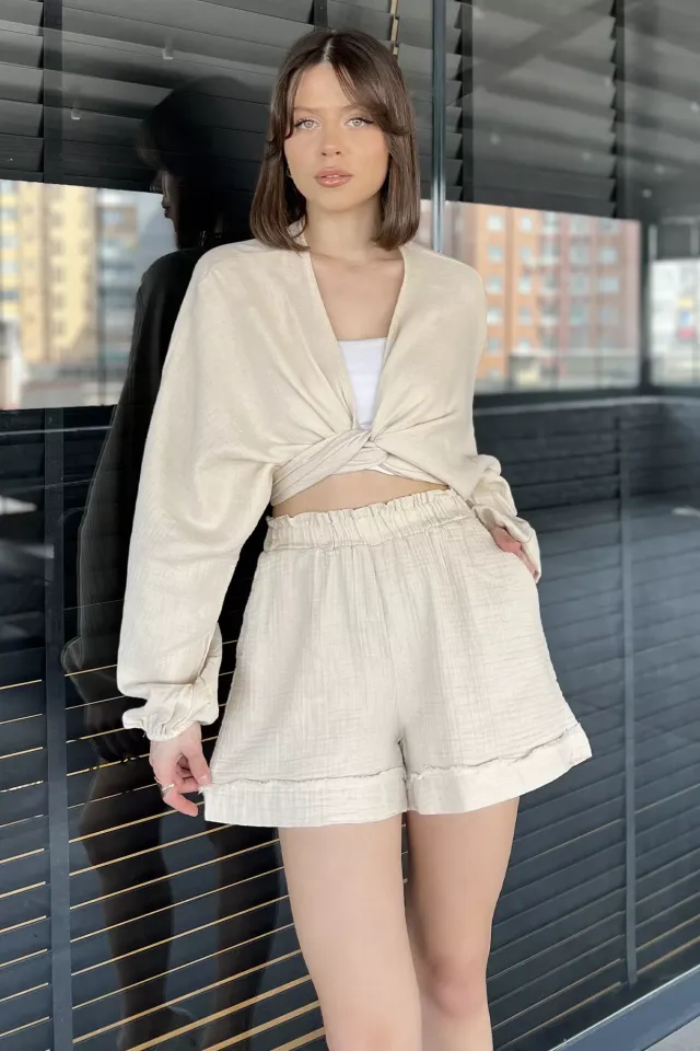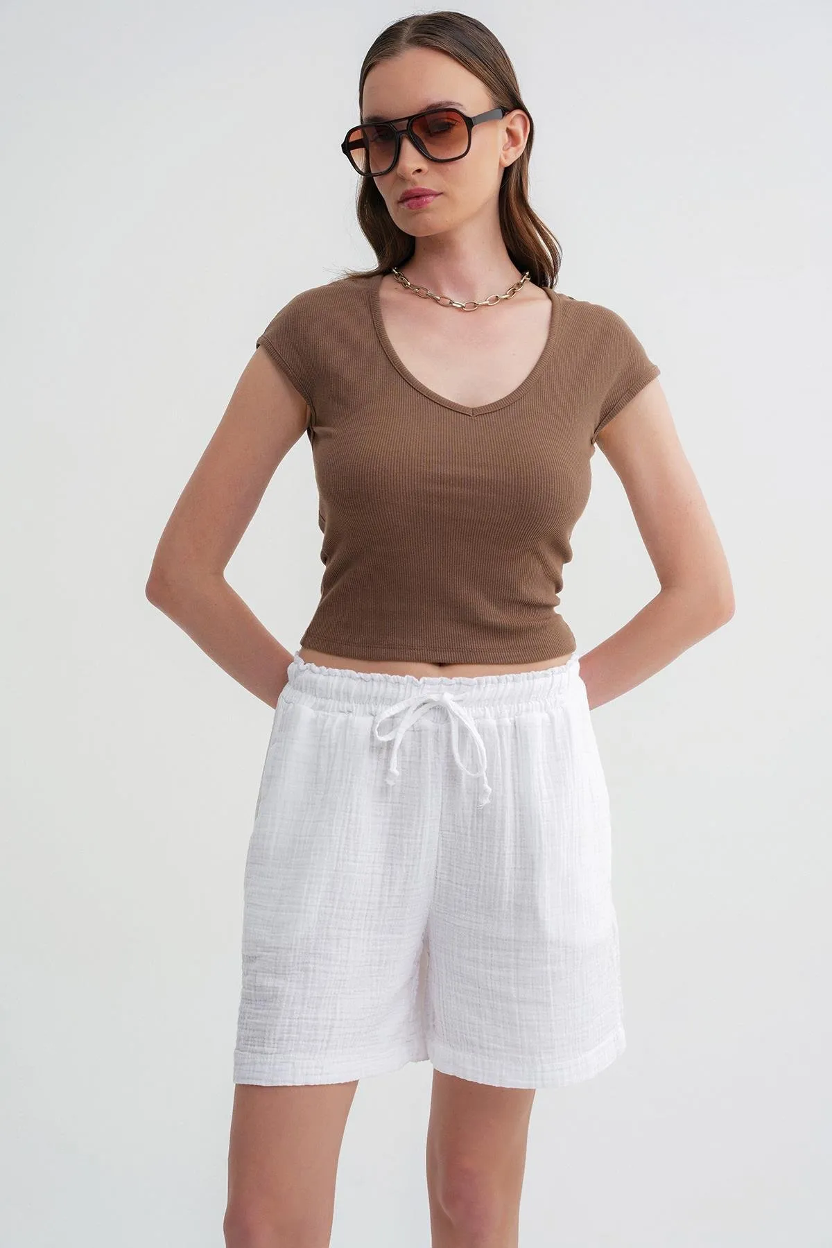 شورت ميني بتفاصيل خطوط وخصر مطاطي — أنيق بلمسة رياضية وخفيف مثالي للنشاط أو الاسترخاء