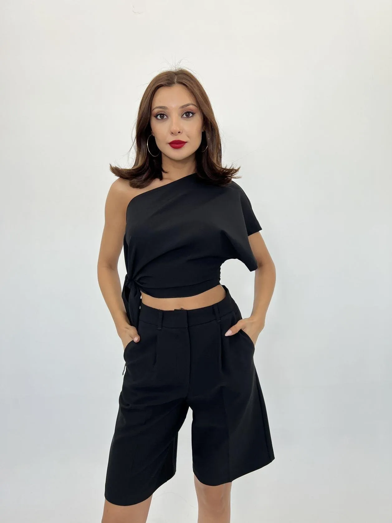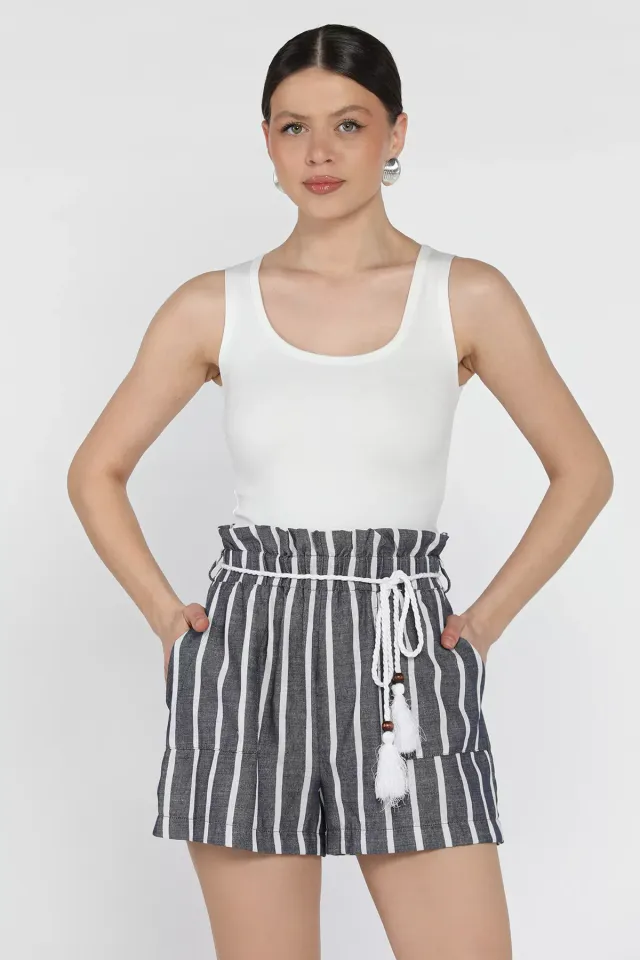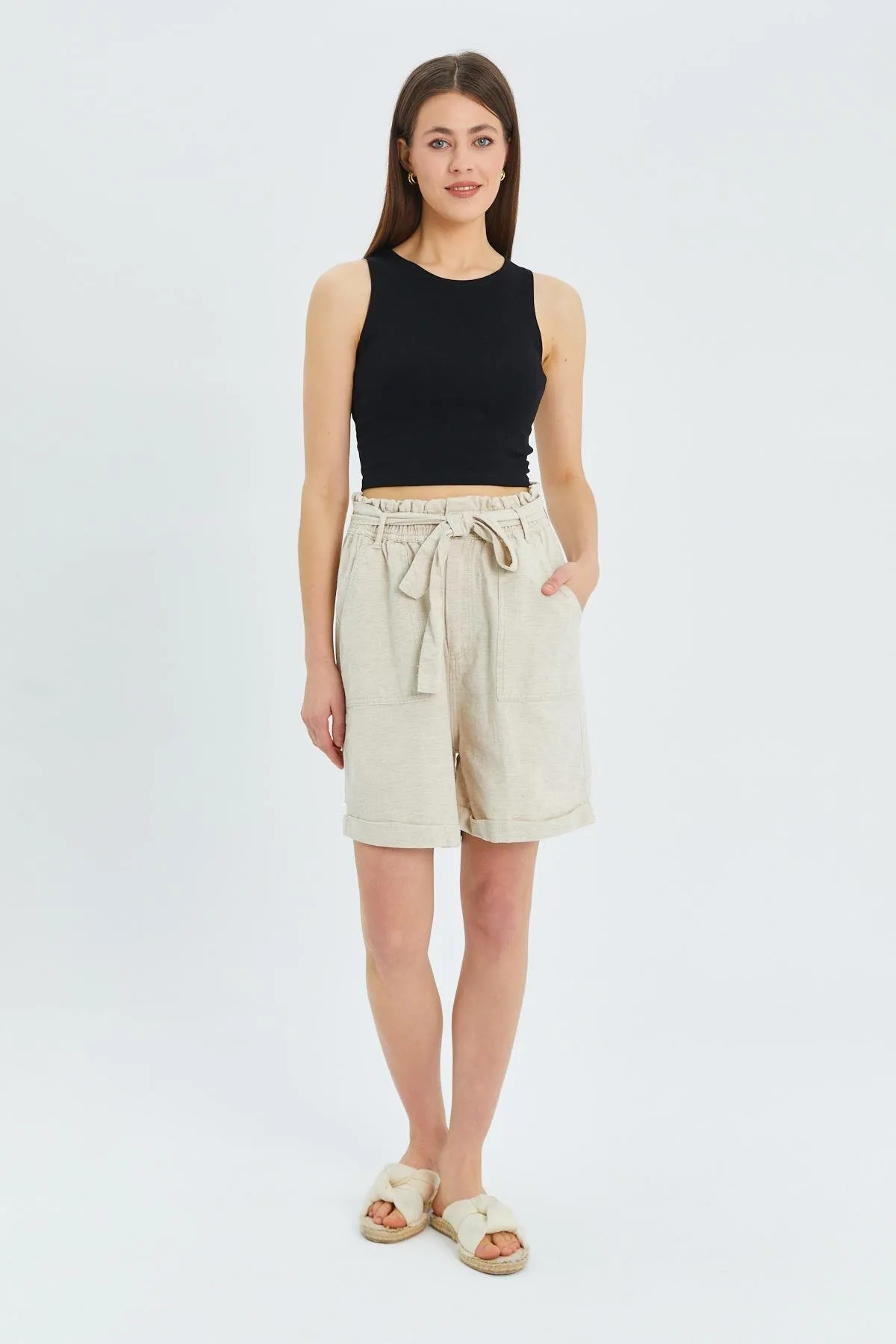 شورت نسائي بخصر مرتفع وتفاصيل طيات مع خصر مطاطي، خفيف وأنيق مثالي لأيام الصيف بأناقة وراحة بلا مجهود.