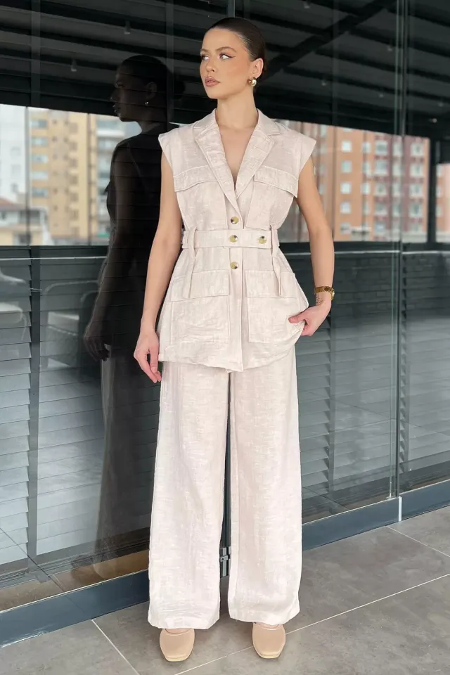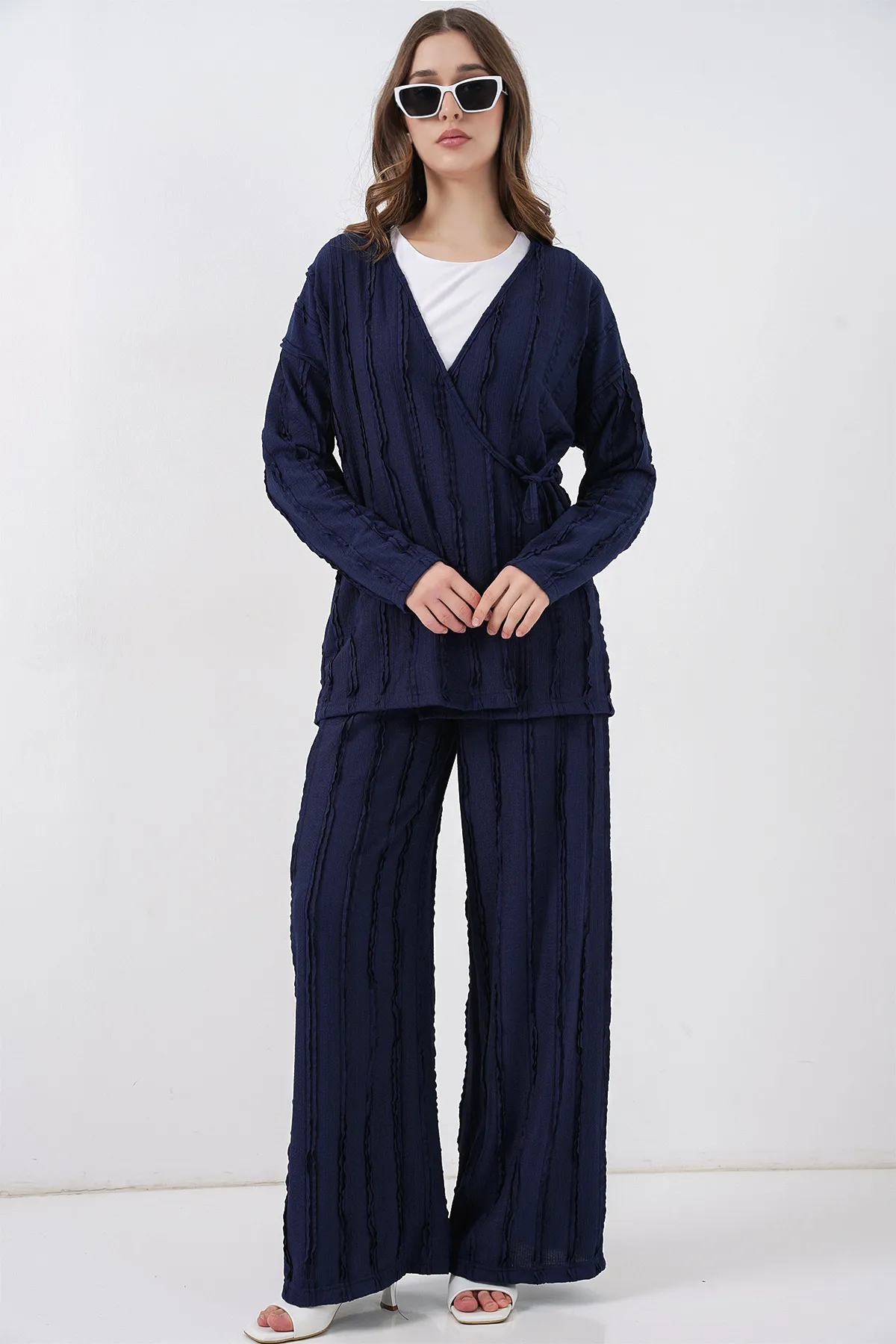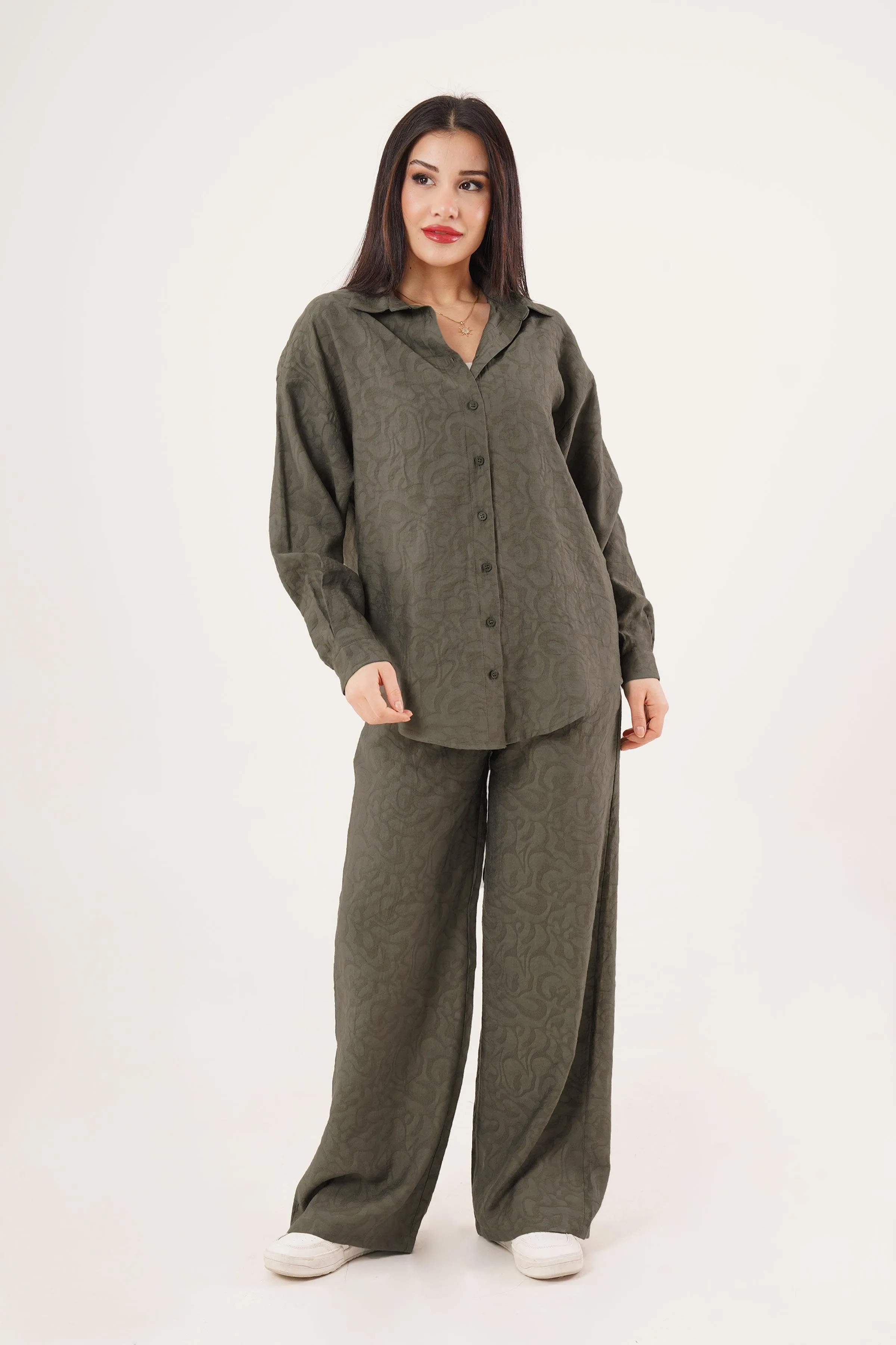 طقم بلوزة نسائي بأكمام قصيرة وخطوط جانبية مع بنطال. مصنوع من قماش ناعم ومريح.